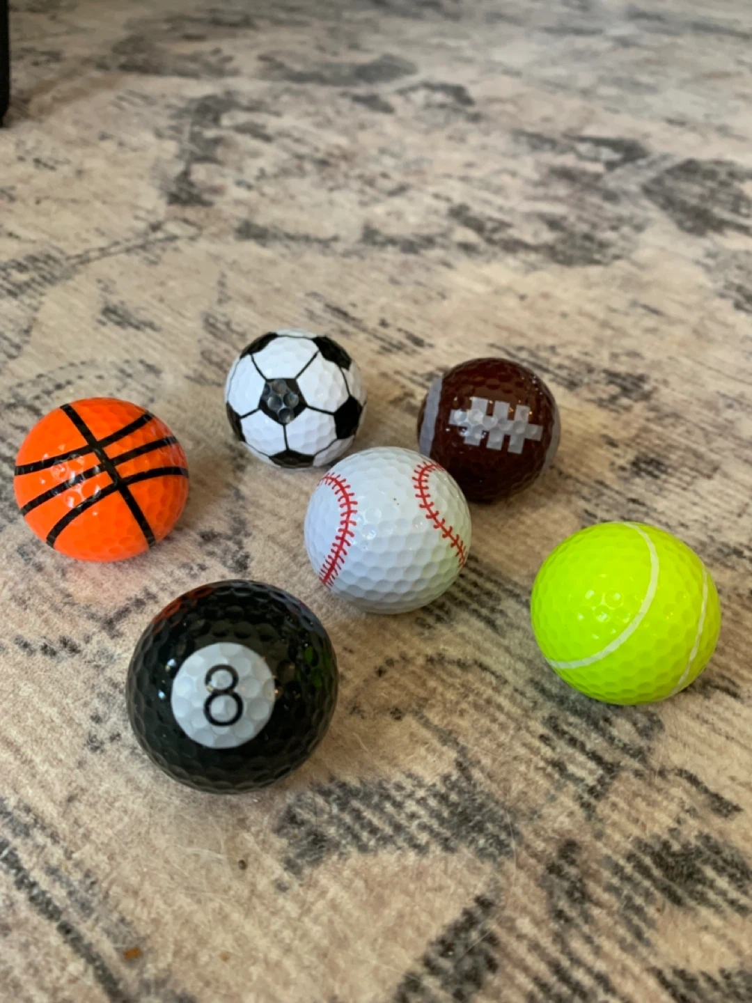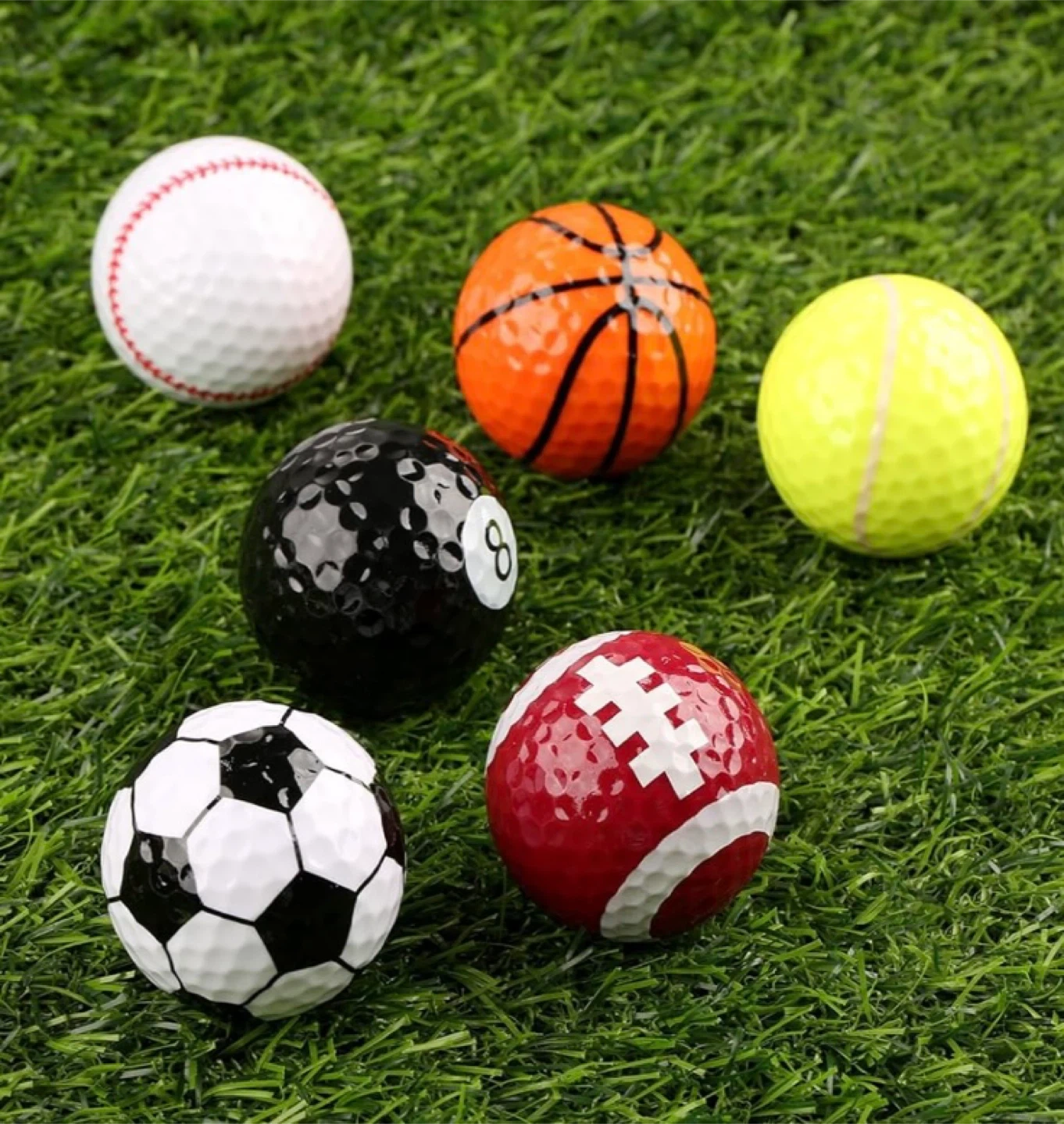 Selling a fun set of golf balls designed with different sports themes! Includes a baseball, basketball, soccer ball, football, tennis ball, and 8-ball design Great for collectibles! Perfect condition