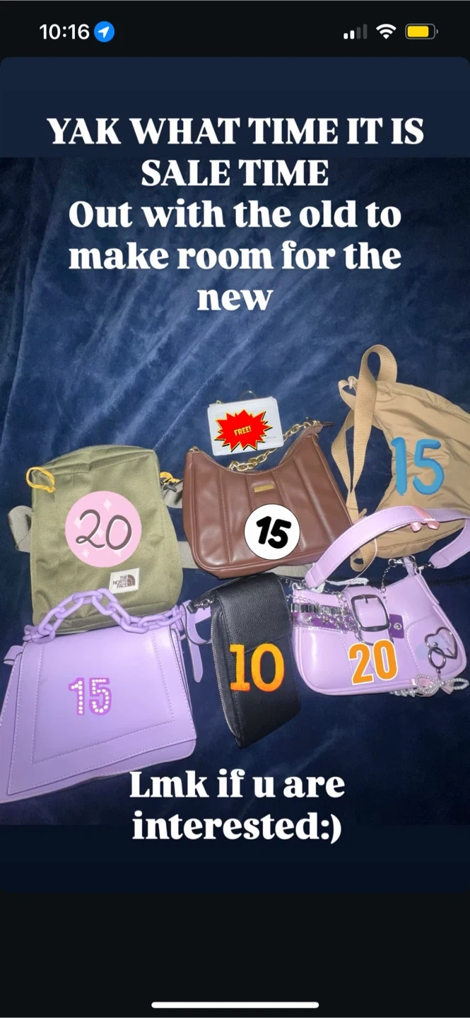 Selling a variety of purses and bags! There's a North Face bag, and several other cute purses in different styles and colours. Prices are marked on the images, ranging from $10 to $20. Perfect for adding some variety to your accessory collection!