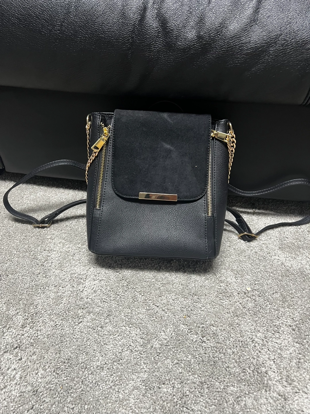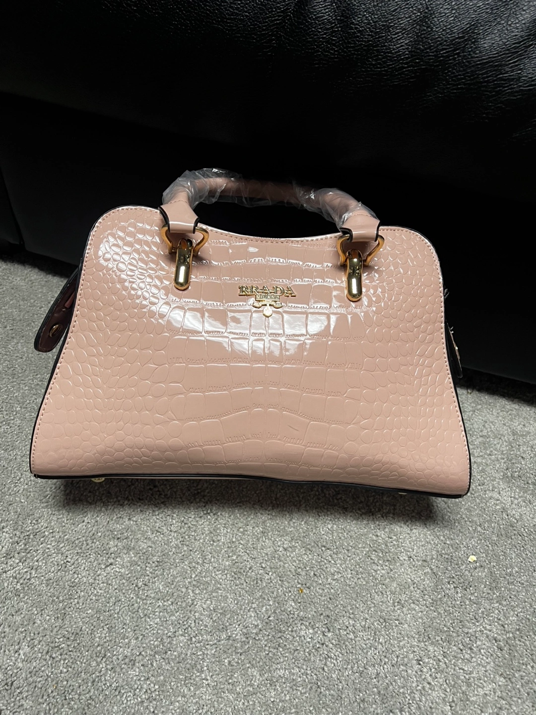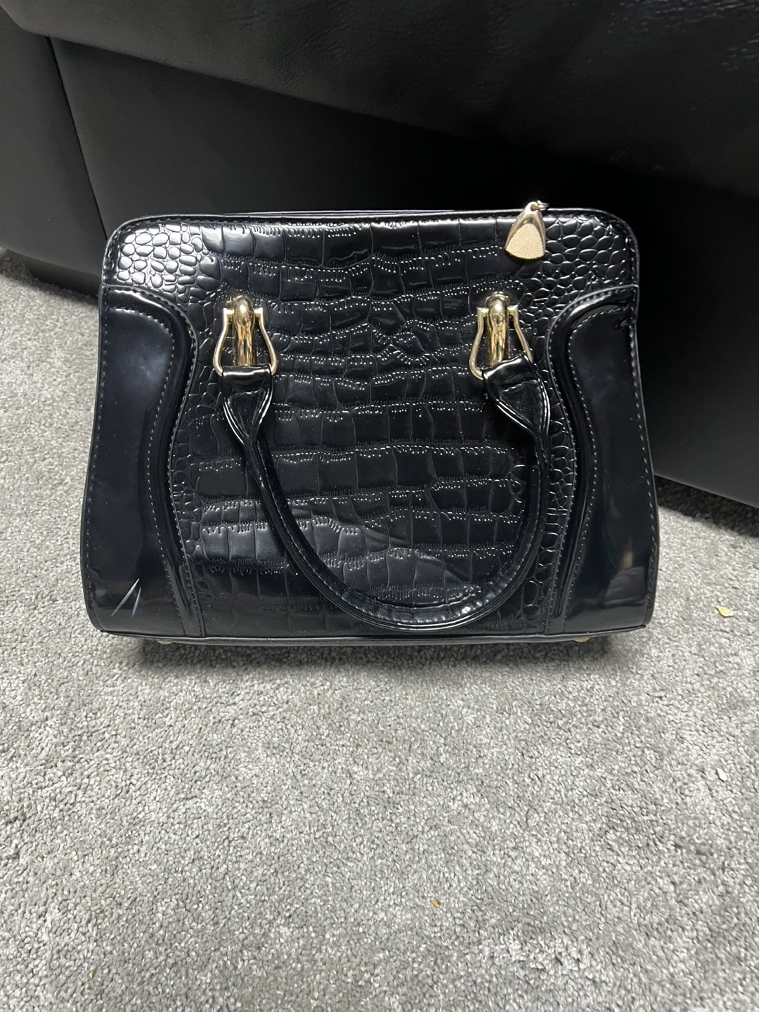 Selling a collection of women's handbags in various styles and colours! There's a brown handbag, a black chain bag, a grey handbag with a ring handle, a black and gold clutch, and a black crocodile-patterned handbag. All in good condition and ready for a new home!