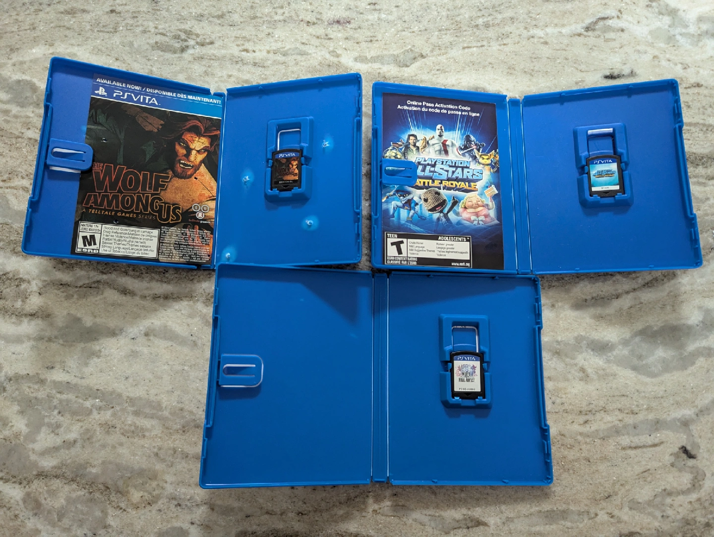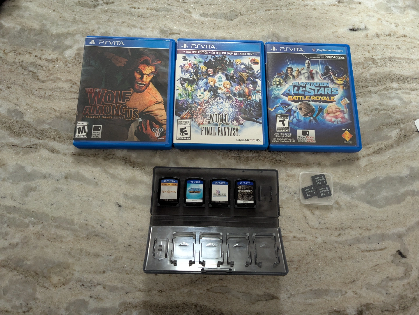 Memory Card 8 GB $20 16 GB $40 32 GB $50 PS VITA GAMES CIB Playstation All-Stars: Battle Royale $20 Wolf Among Us $25 World of Final Fantasy $25 Loose Playstation All-Stars: Battle Royale $15 God of War Collection $50 Final Fantasy X-2 HD Remaster $10 Uncharted: Golden Abyss $30