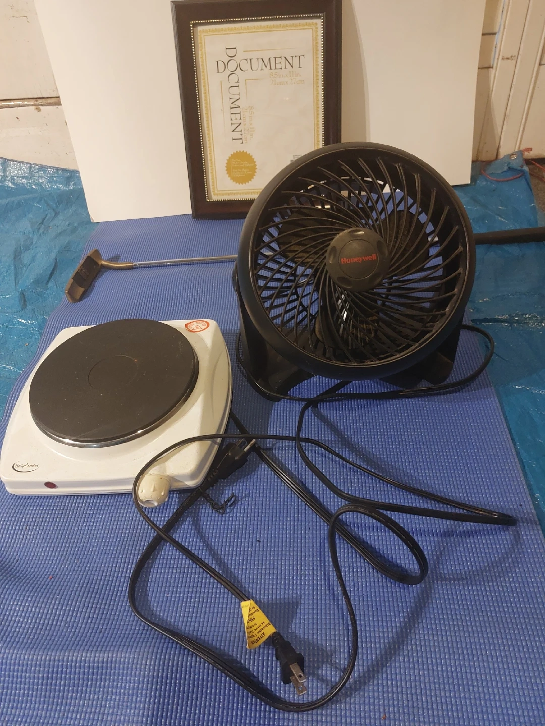 61selling a various items. some items were already sold so I made new list. electric portable burner for 120v, a photo frame, eletric fan, golf putter, yoga mat, soldering kit, extension pole, hat washer, luckea resistance band kit for exercise. These items sell all together. If u buy individually, the price will go up.