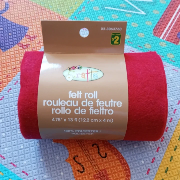This is a red felt roll from Cross Crafts. It's 4.75 inches by 13 feet (12.2 cm x 4 m). The material is 100% polyester.