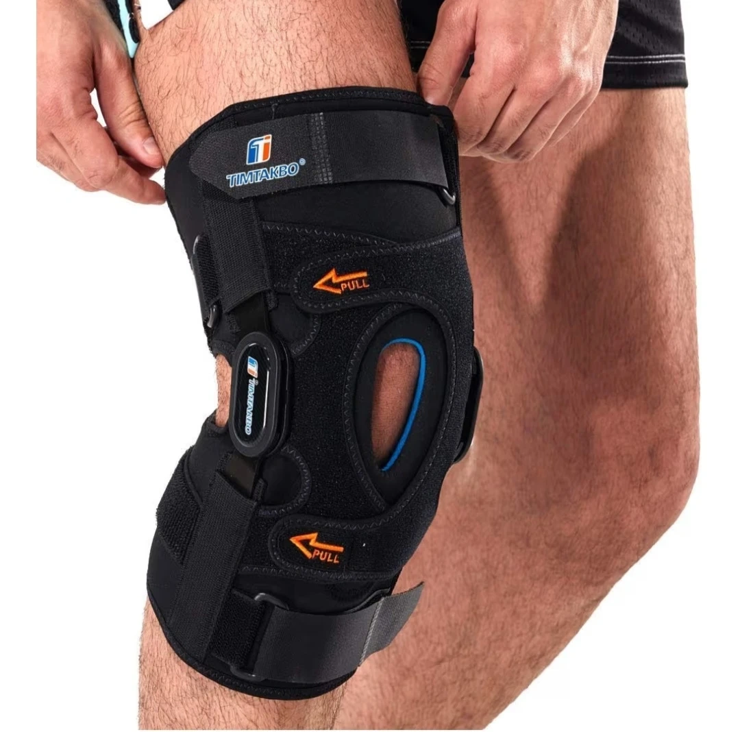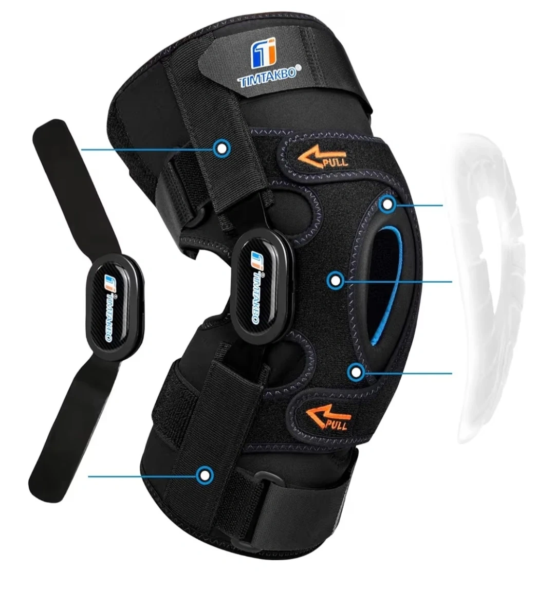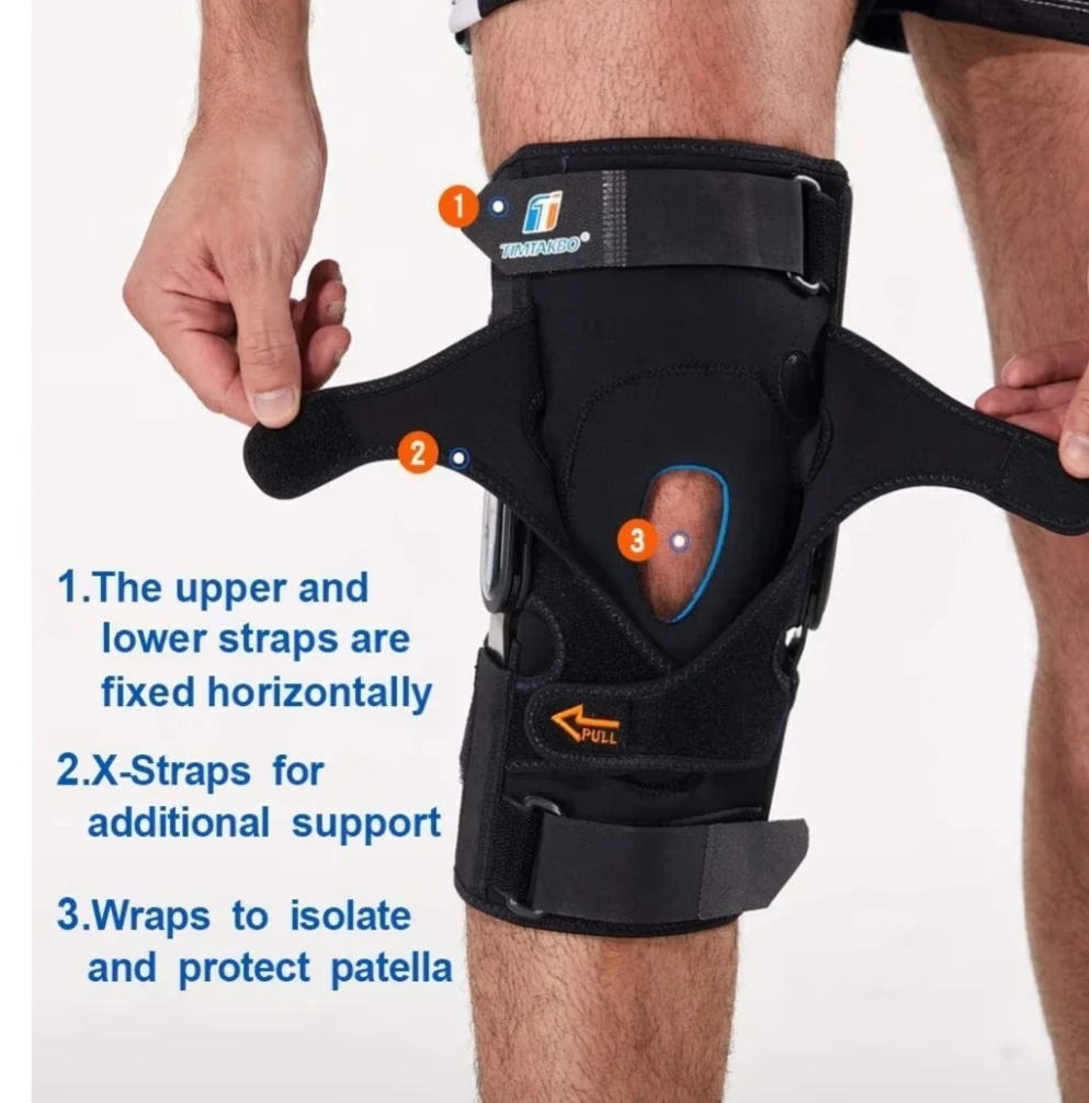 This is a TIMTAKBO hinged knee brace. Provides GEL patella support and has removable dual side stabilizers. It's designed for support and stability. The brace is made of durable material and features adjustable straps for a custom fit.