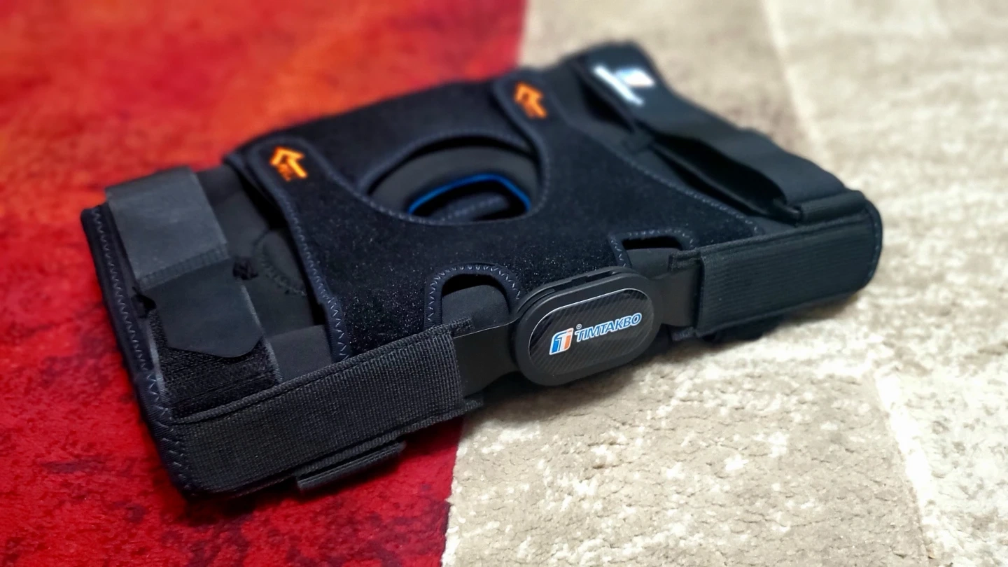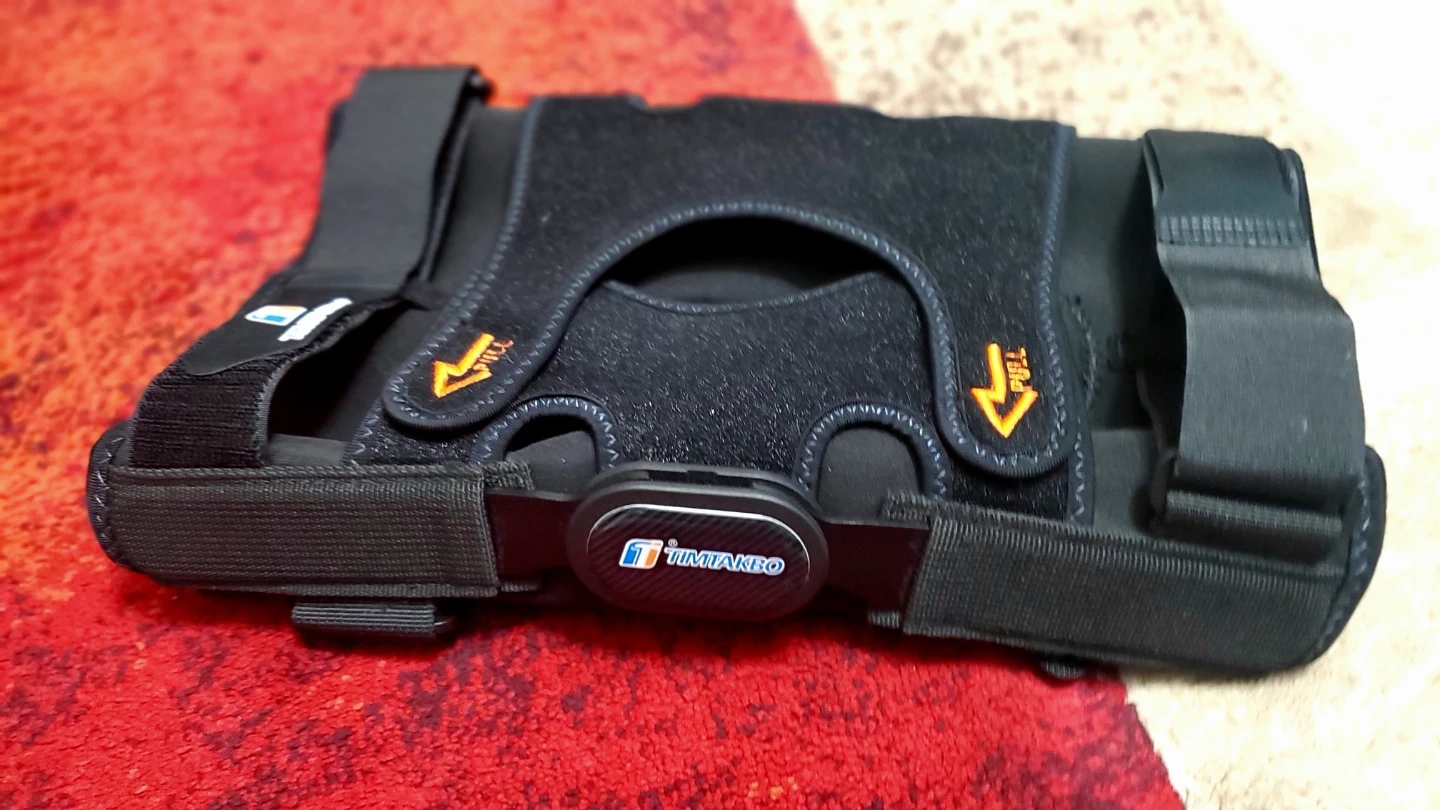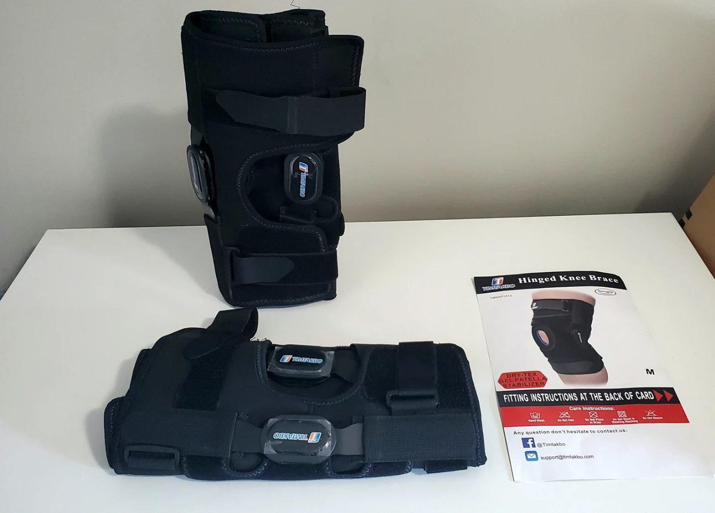 This is a TIMTAKBO hinged knee brace. Provides GEL patella support and has removable dual side stabilizers. It's designed for support and stability. The brace is made of durable material and features adjustable straps for a custom fit.