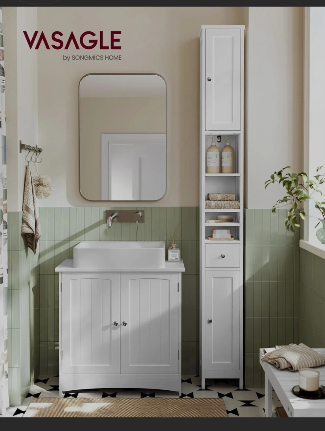 10Selling a brand new VASAGLE bathroom cabinet! It's still in its original box and ready to be assembled. This tall cabinet is perfect for adding extra storage to your bathroom. It features shelves, a drawer, and two doors to keep your essentials organized and out of sight. The dimensions are 19.5 cm x 21.4 cm x 180 cm.
