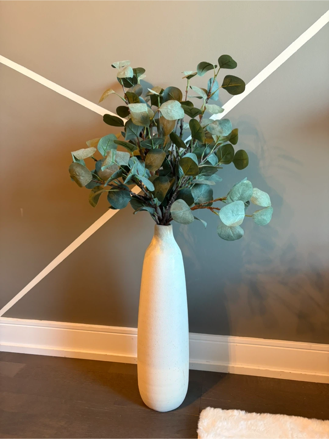 65Selling a vase with some eucalyptus stems. It's in good condition and would look great in any room