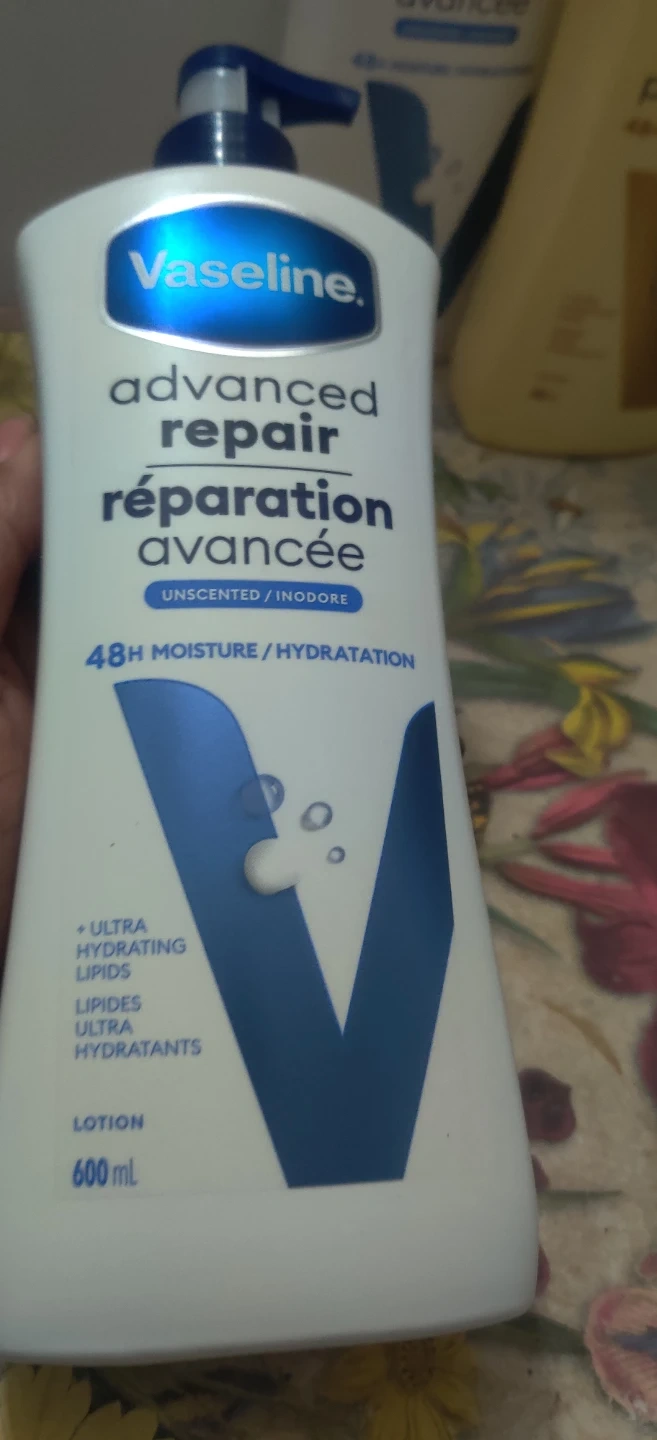 I'm selling 3 bottles of Vaseline Advanced Repair lotion. It's unscented and provides 48-hour moisture. Each bottle contains 600mL of lotion.
