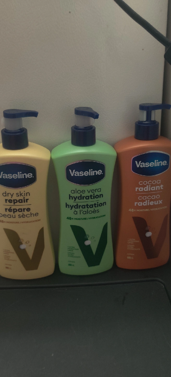 I have three bottles of Vaseline lotion available: - Dry Skin Repair - Aloe Vera Hydration - Cocoa Radiant Each bottle contains 600ml of lotion to keep your skin moisturized and healthy