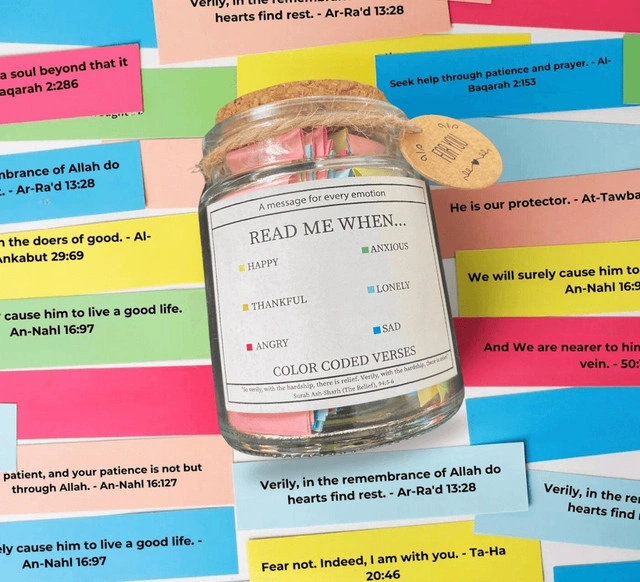 70This Vasve Guidance Jar is a thoughtful gift, filled with colour-coded Quran verses for daily spiritual guidance and comfort. This jar is brand new and comes in its original packaging, ready to bring peace and inspiration to its recipient. Here's what makes it special: * Color-Coded Verses: Each colour represents a different emotion or situation. * Inspirational: Offers daily reminders and spiritual support. * Perfect Gift: Ideal for anyone seeking comfort and guidance from the Quran. If the ad is up, it's available!