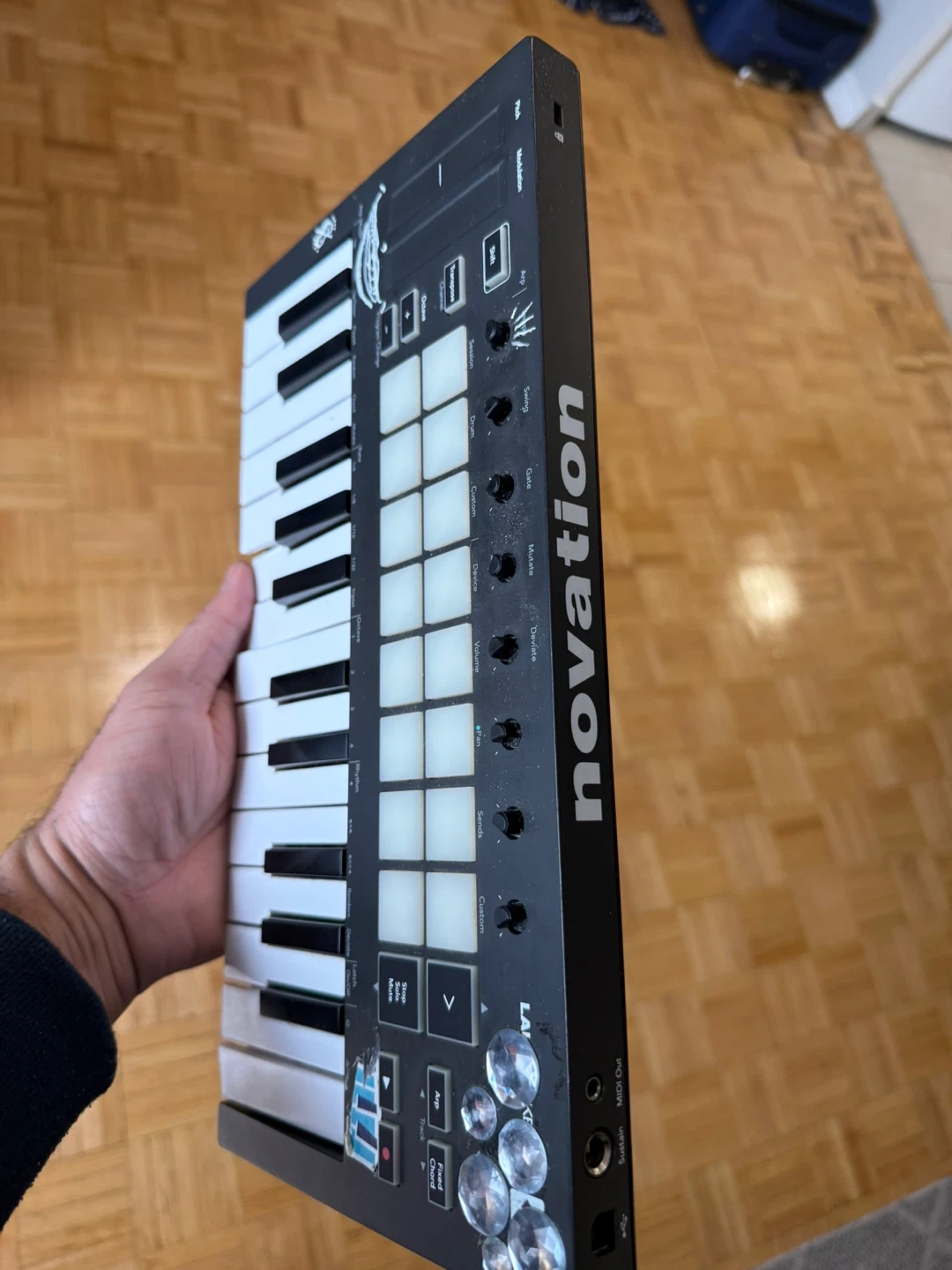 This is a Novation Launchkey Mini MIDI keyboard controller. It's a compact device with 25 mini keys and RGB-backlit pads. Great for music production on the go!
