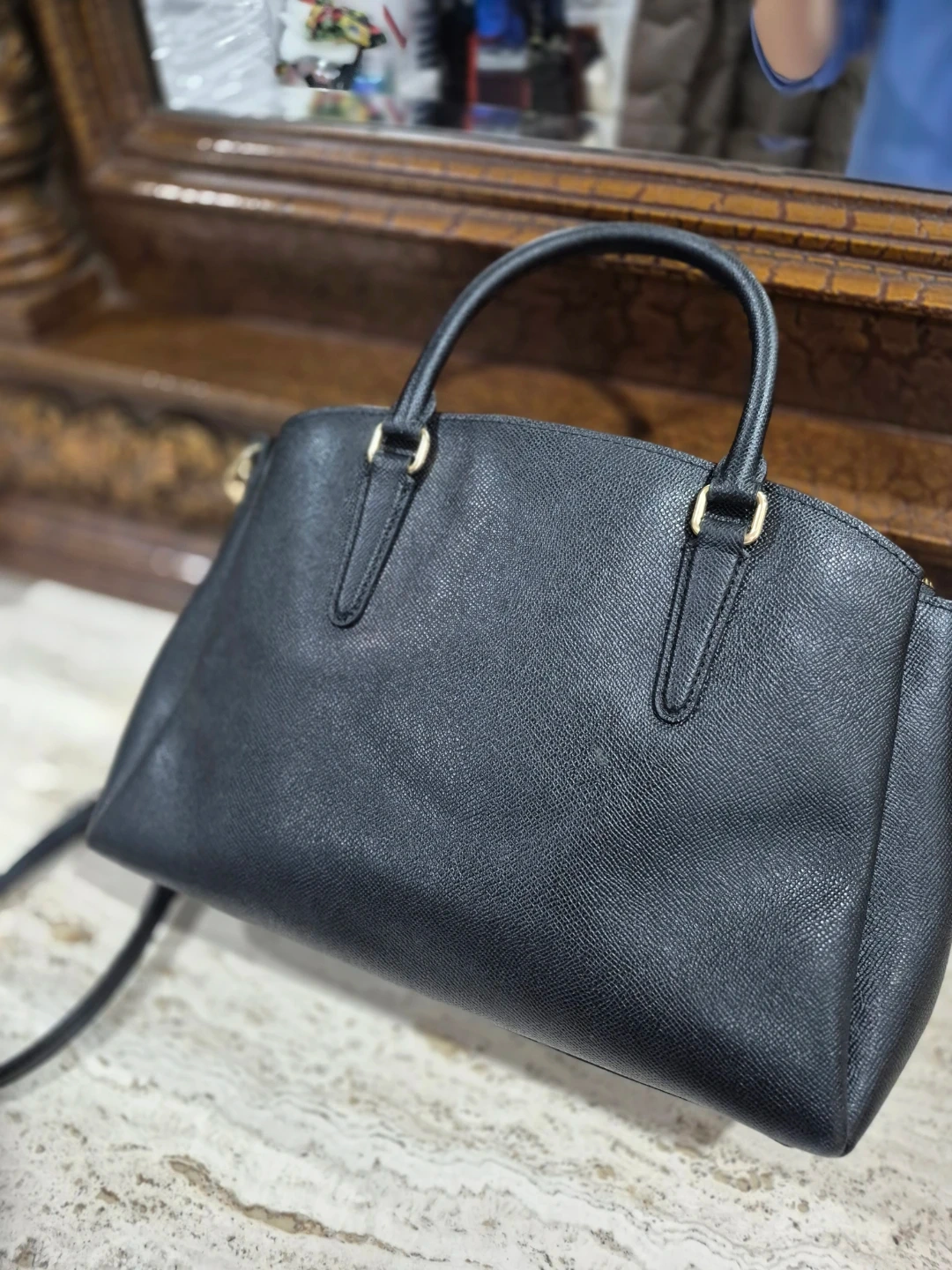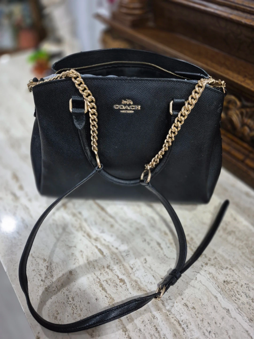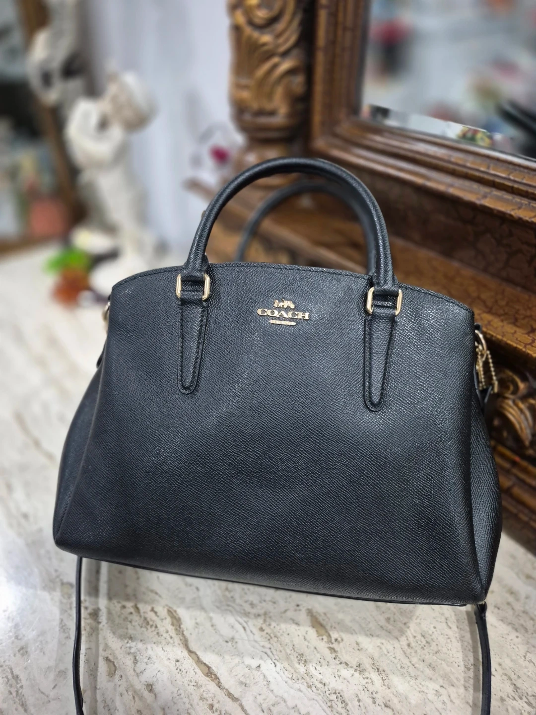 This is a black pebble leather satchel handbag from Coach. It features gold-tone hardware and a detachable crossbody strap. The interior has multiple compartments for organization.