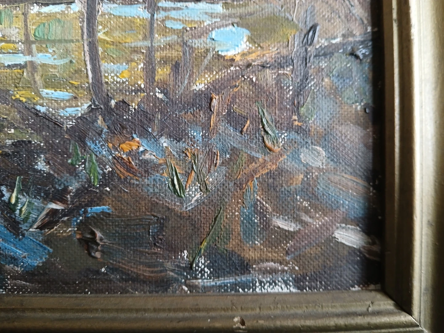 Heavily influenced by the( Group of Seven ). The signiture is likely under the frame. Condition: The paint surface is vibrant and well preserved. Water marks behind the painting have not effected the painting whatsoever.