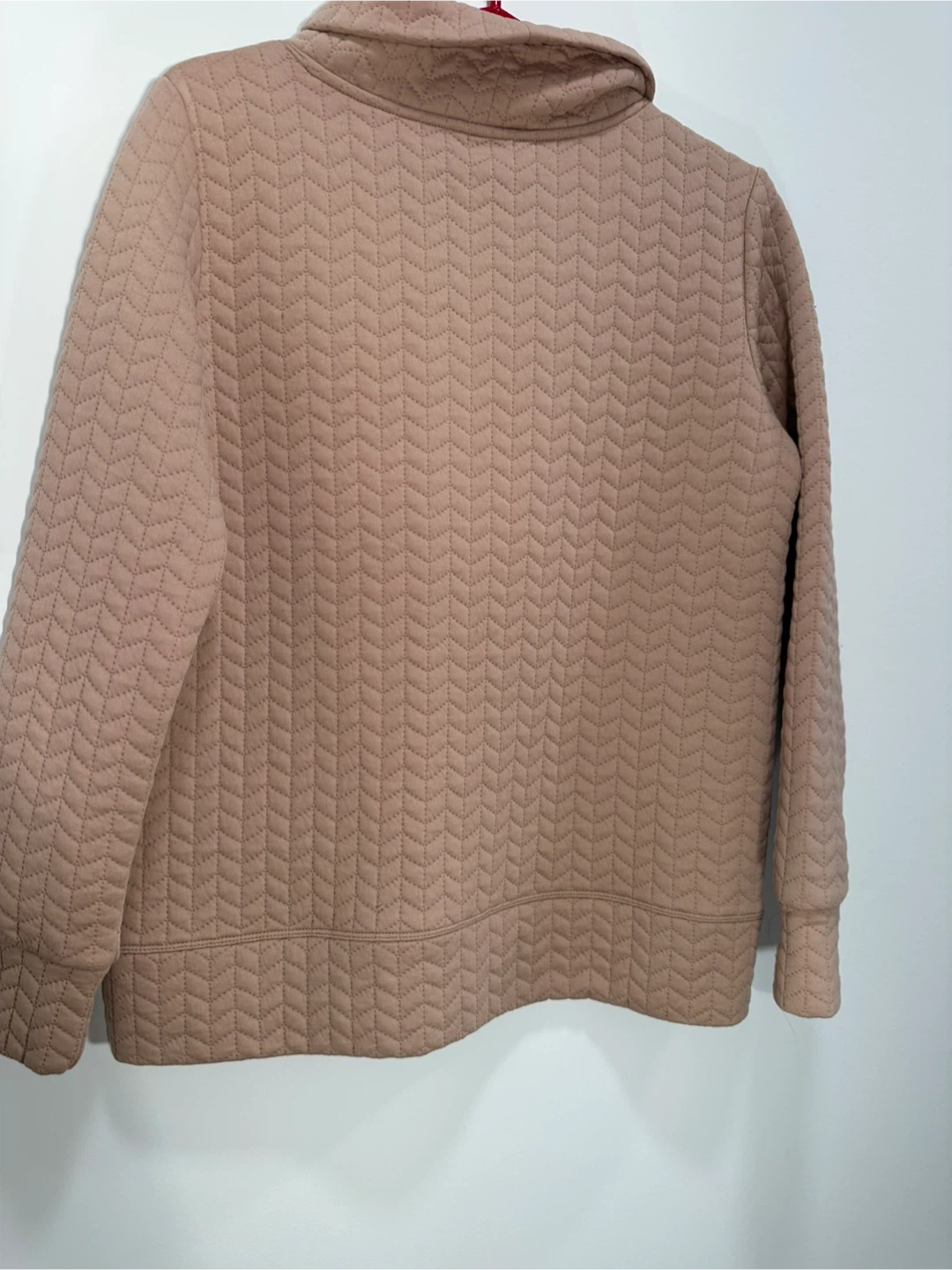 This Joe Fresh Active sweatshirt is made of a soft, quilted material. It features a mock neck and decorative buttons on the sides. Size is medium/medium.