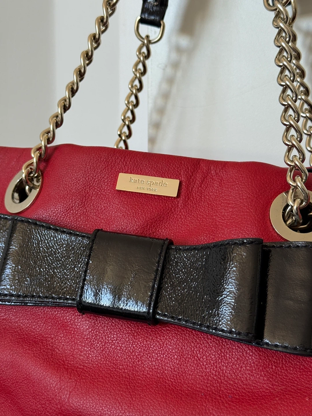 Kate Spade Red Leather Tote Bag with Black Bow and Chain Straps