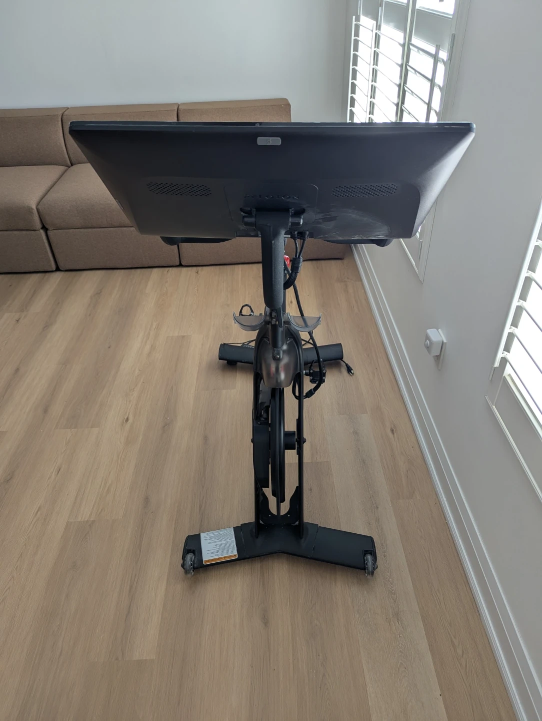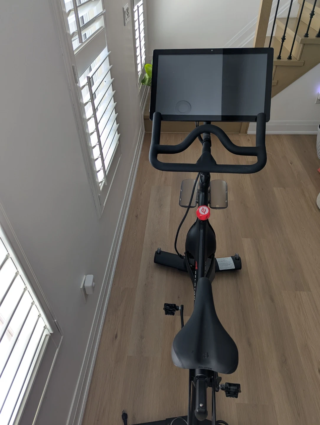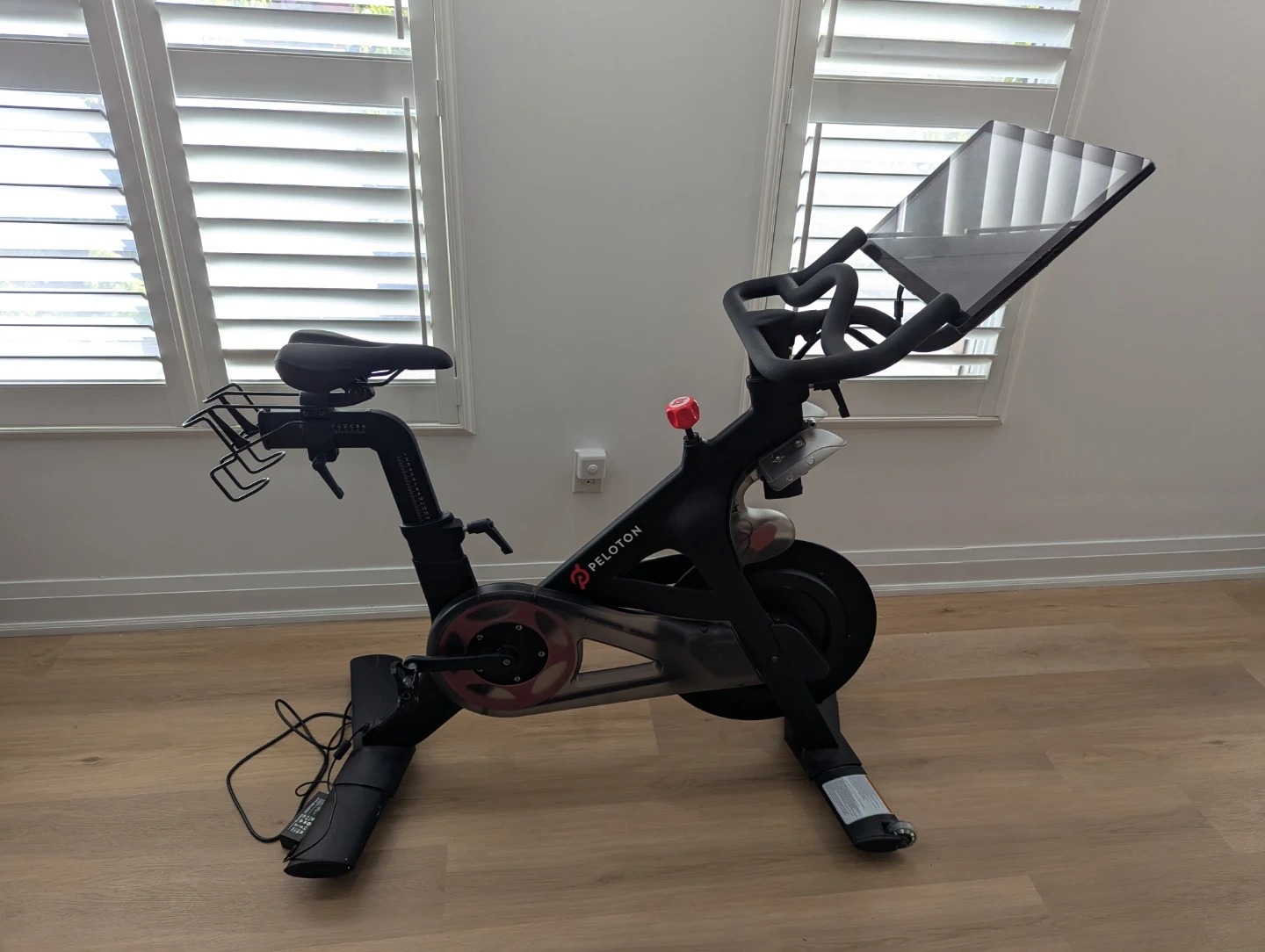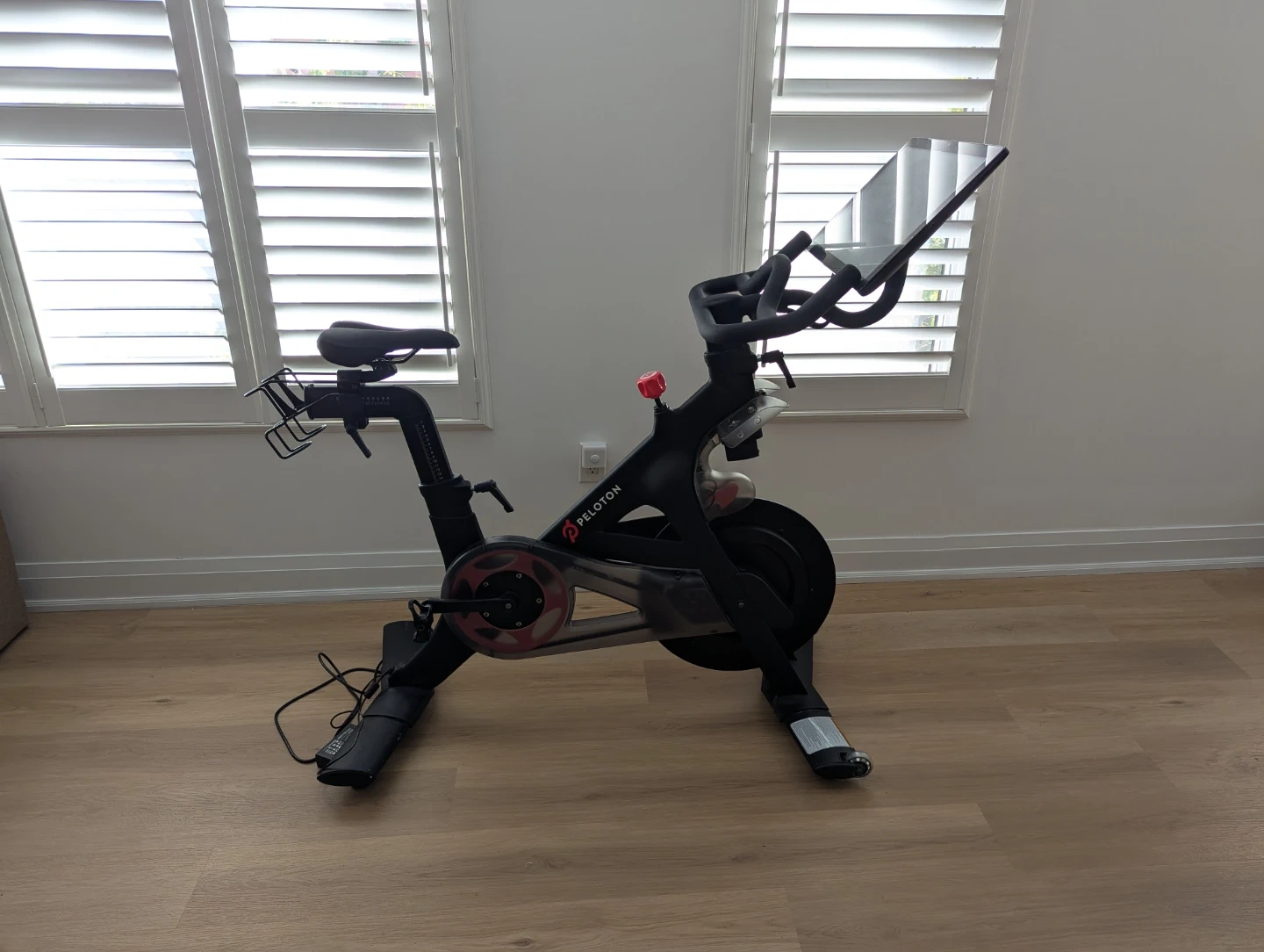 This is a Peloton Bike+ with a large touchscreen. It's in black and comes with adjustable handlebars and seat. Includes pedals and water bottle holder. Only two years old, hardly ever used did not have time.
