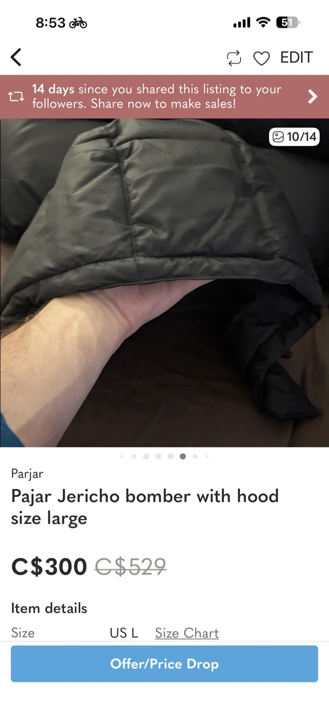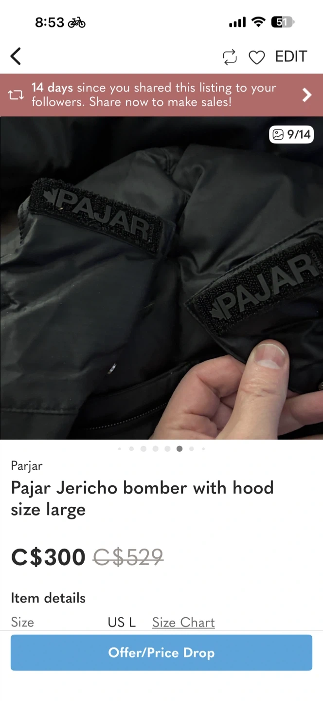 This is a Parjar Pajar Jericho bomber jacket. It's a size large and features a hood. It's black and seems to be made of a puffy material.