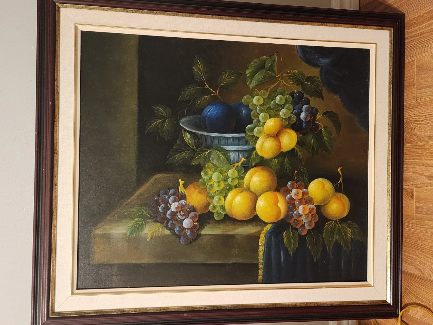 This is a framed oil painting depicting a still life of various fruits, including grapes, plums, and apricots. The artwork is presented in a classic style. It's a lovely piece for any home decor!