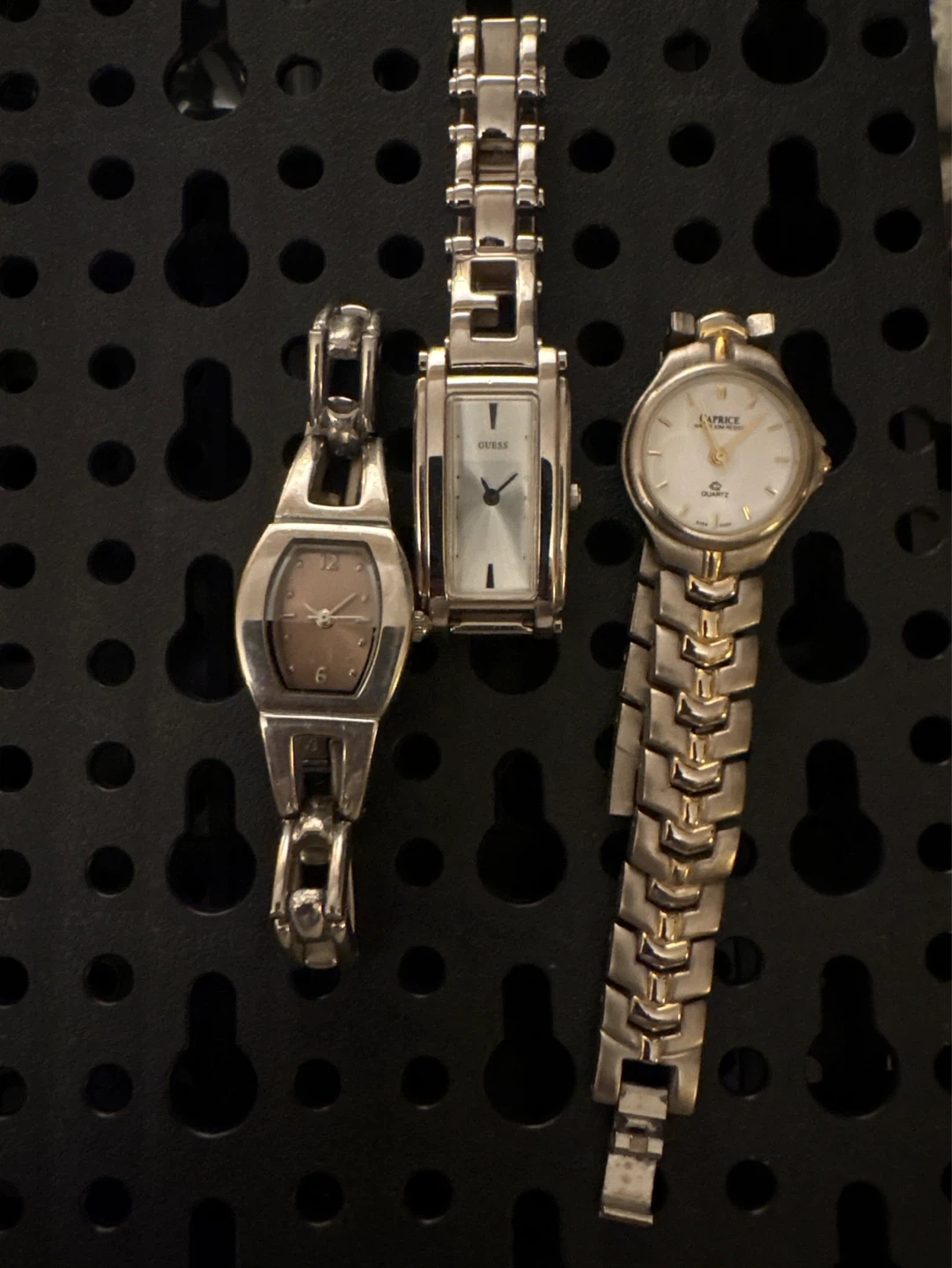 This is a Caprice quartz watch with water resistance. A guess watch. And 1 other. All are vintage. Batteries in all 3