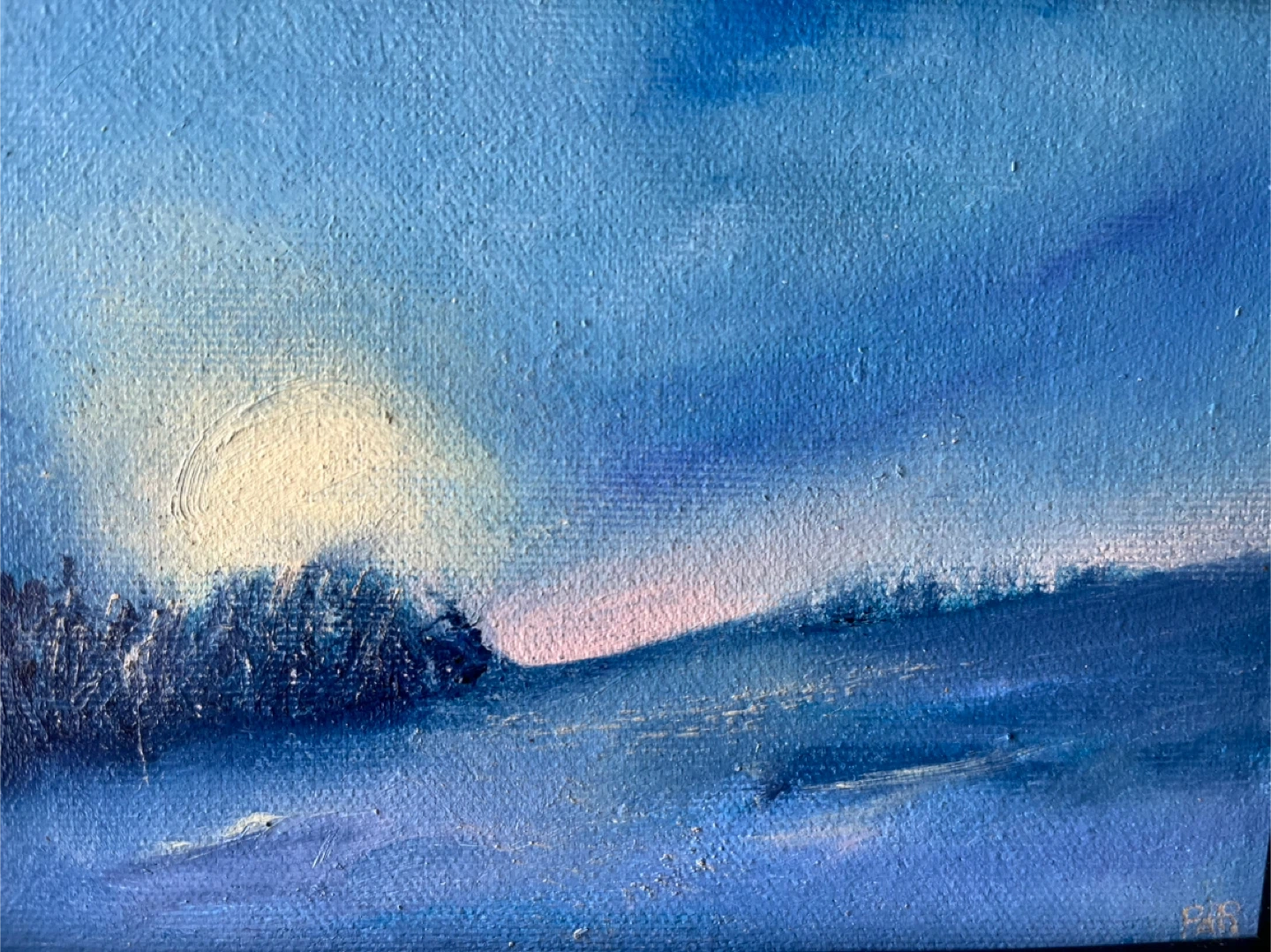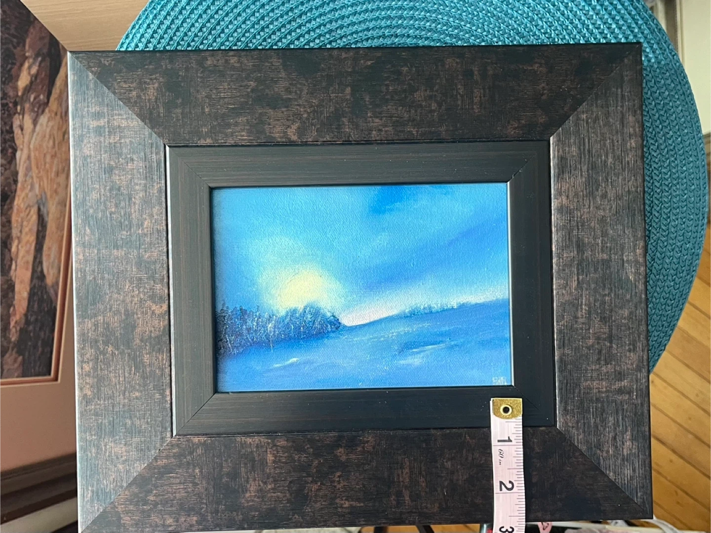 “Prairie Winter Dawn”, 5x7, oil on canvas, by a local artist (the seller). Framed to 10x12 in a rich brown faux wood frame.