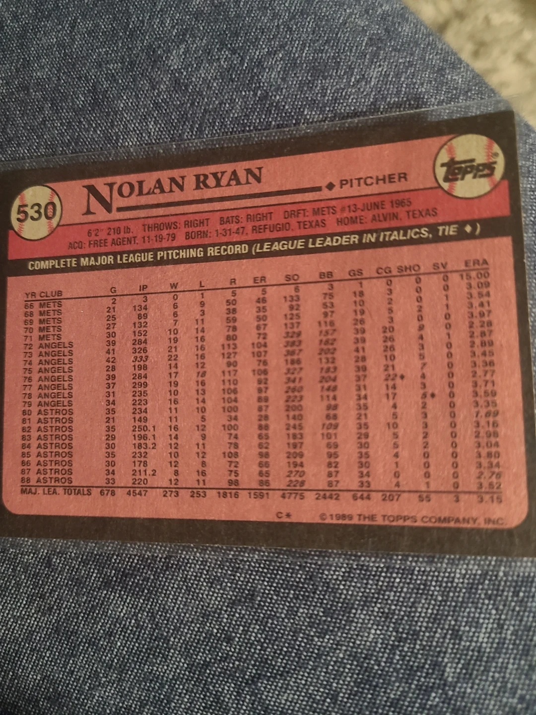 This is a 1989 Topps Nolan Ryan baseball card, number 530. It features his complete major league pitching record. A great addition for any baseball collector!