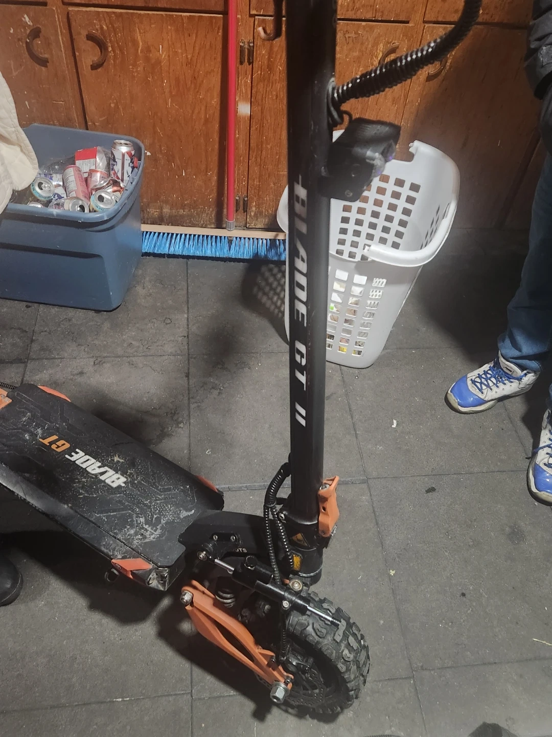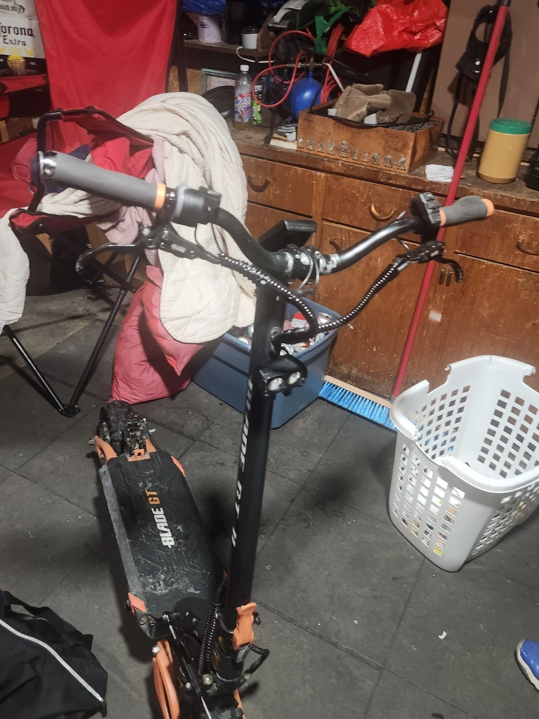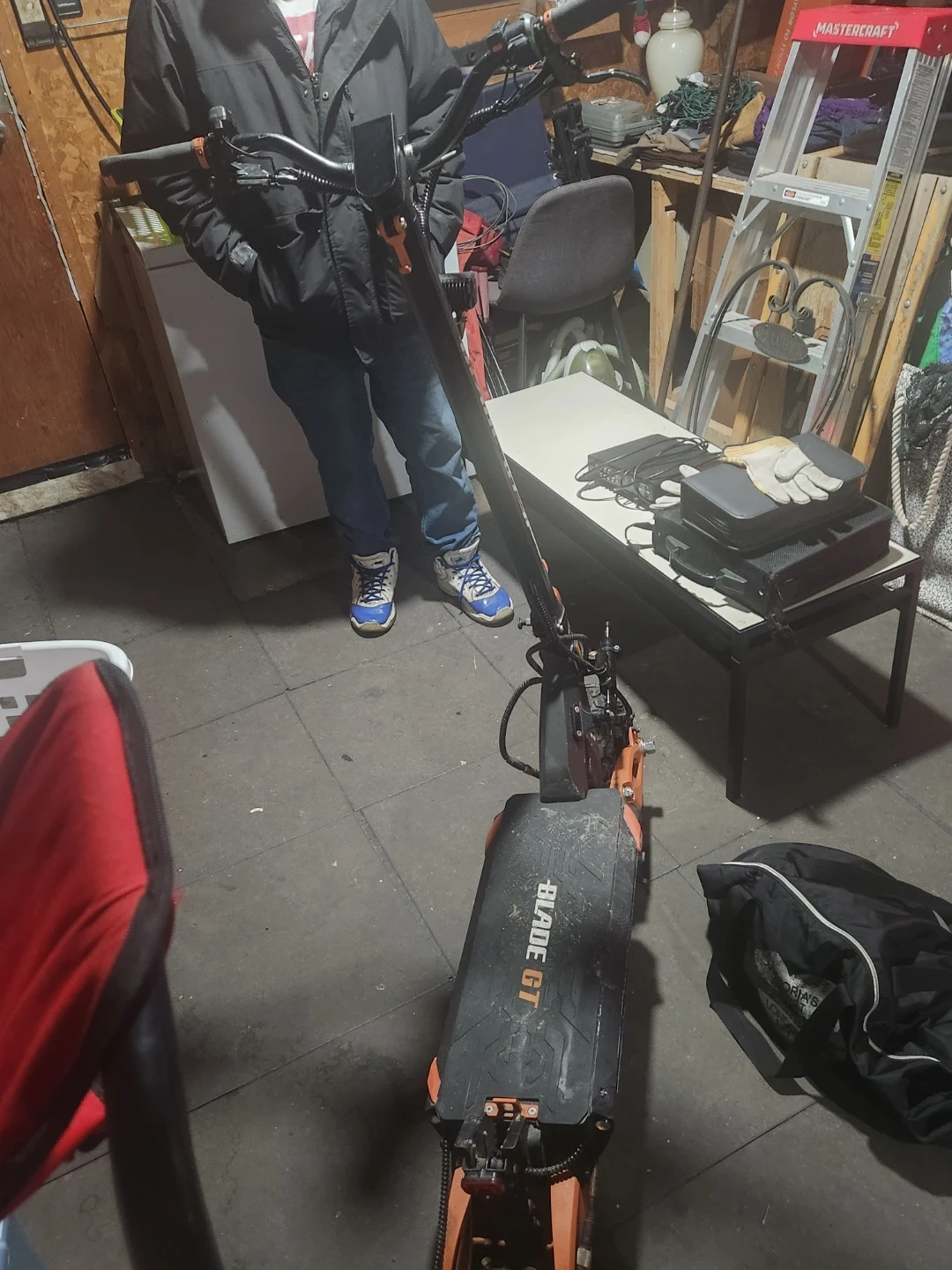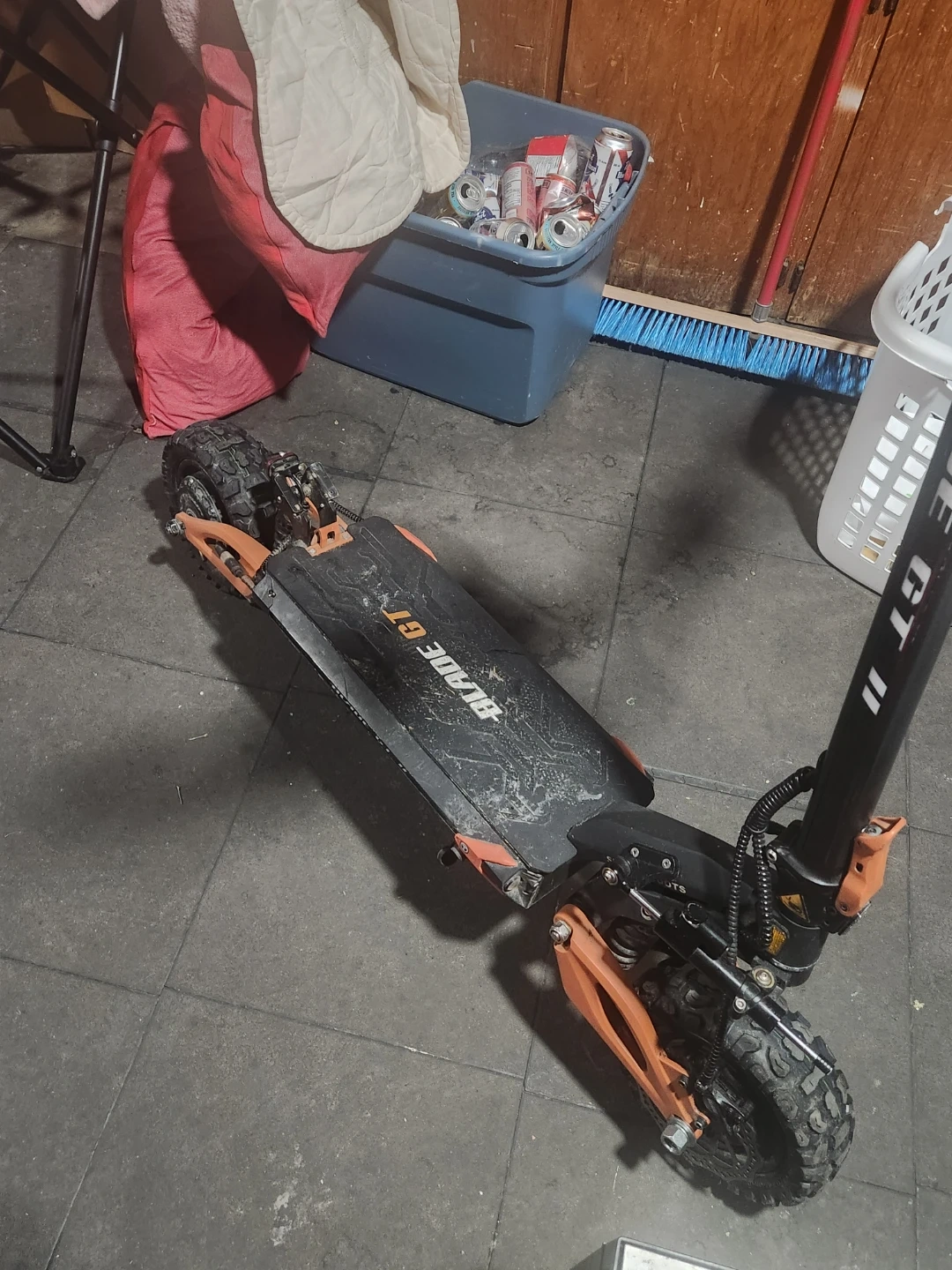 Selling a Blade GT II electric pro scooter. It's black and orange with rugged tires. Has a digital display on the handlebars. Does 95 km. And is it. Great condition asking 1600