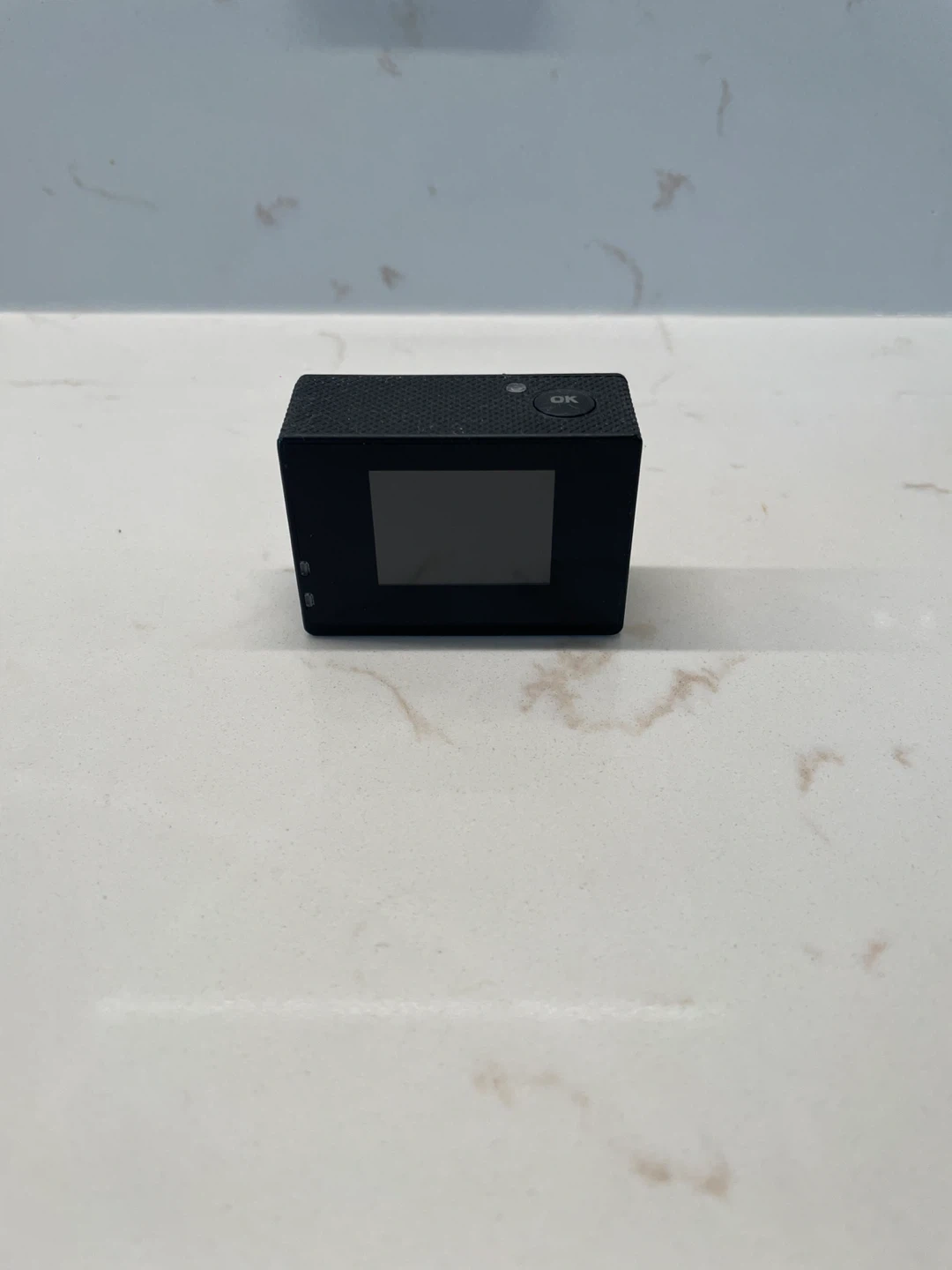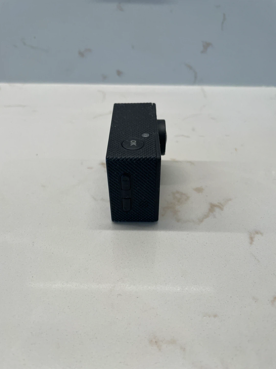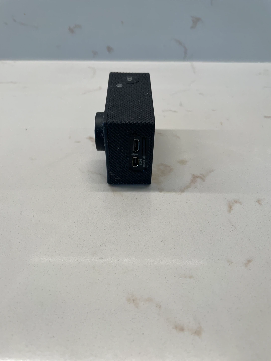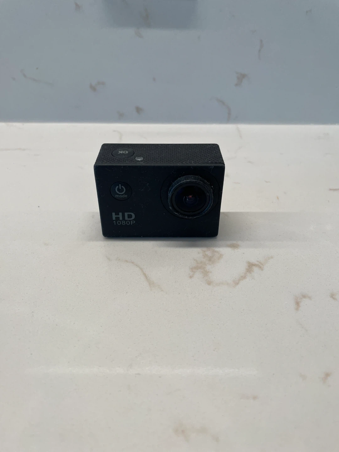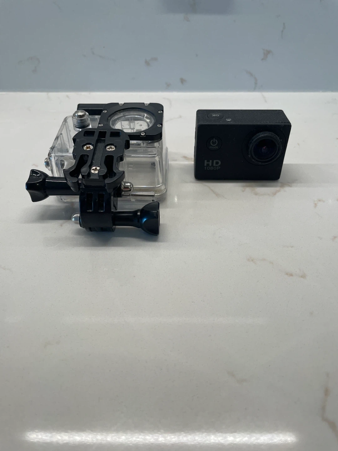This is a black HD 1080p action camera. It comes with a waterproof case and mounting accessories. Records video at 1080p resolution.