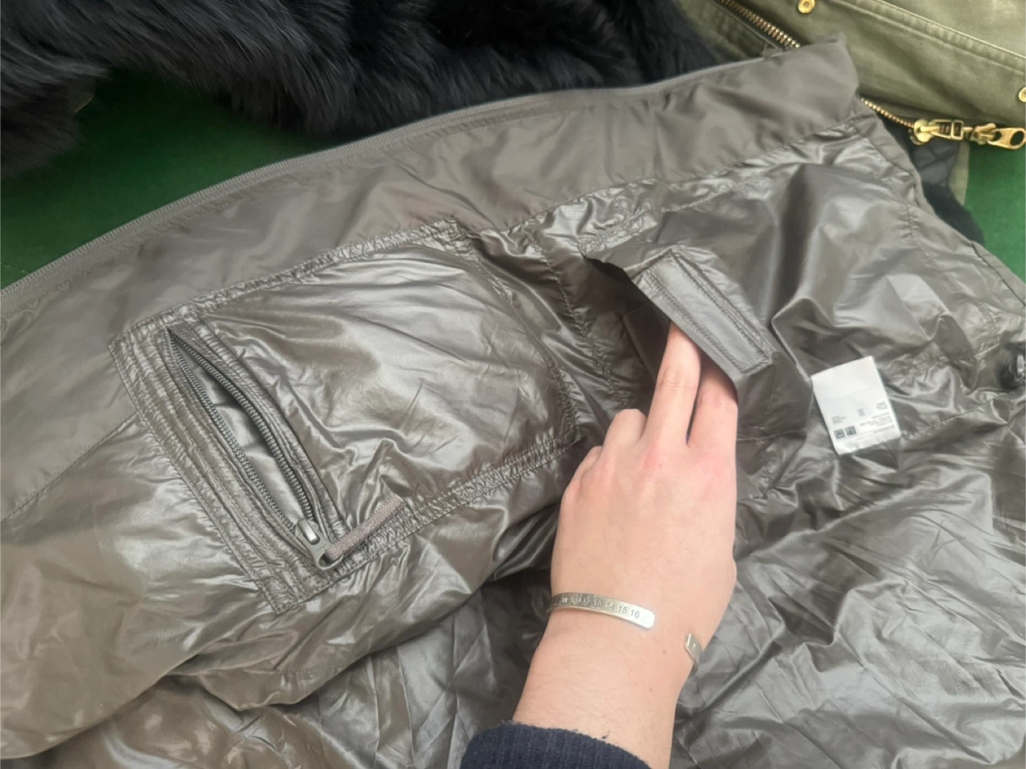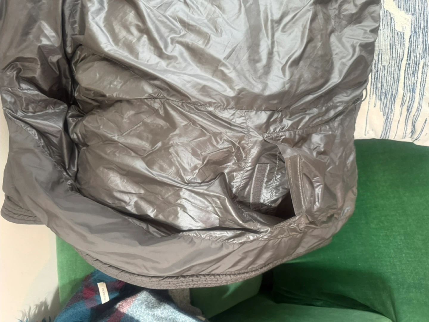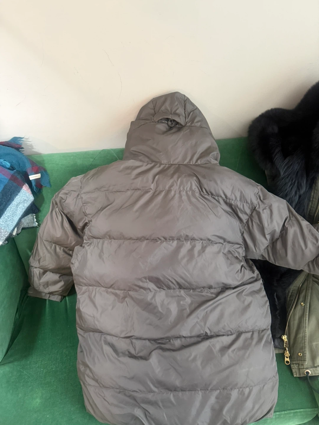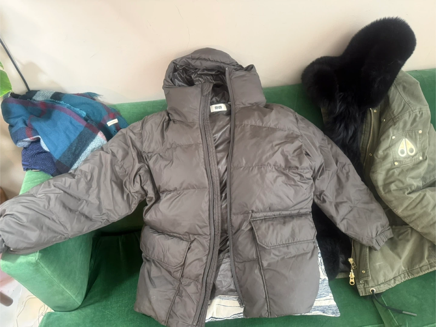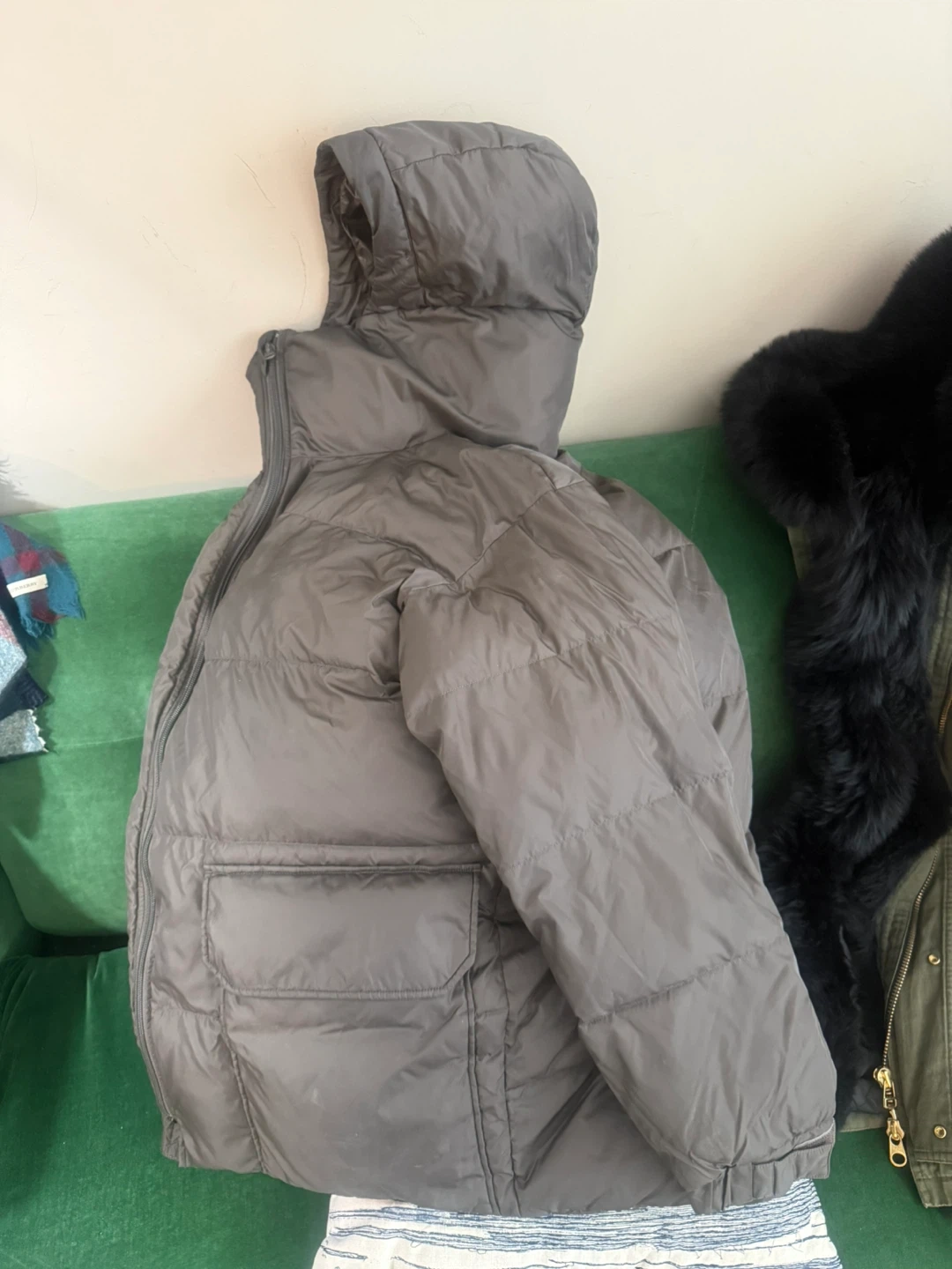 Uniqlo U collection puffer jacket in Gray color with slight olive green tone. It features a zip-up front and two front pockets with snap closures. Size S, fits oversized to M/L, It's a warm and stylish outerwear option for showing days.