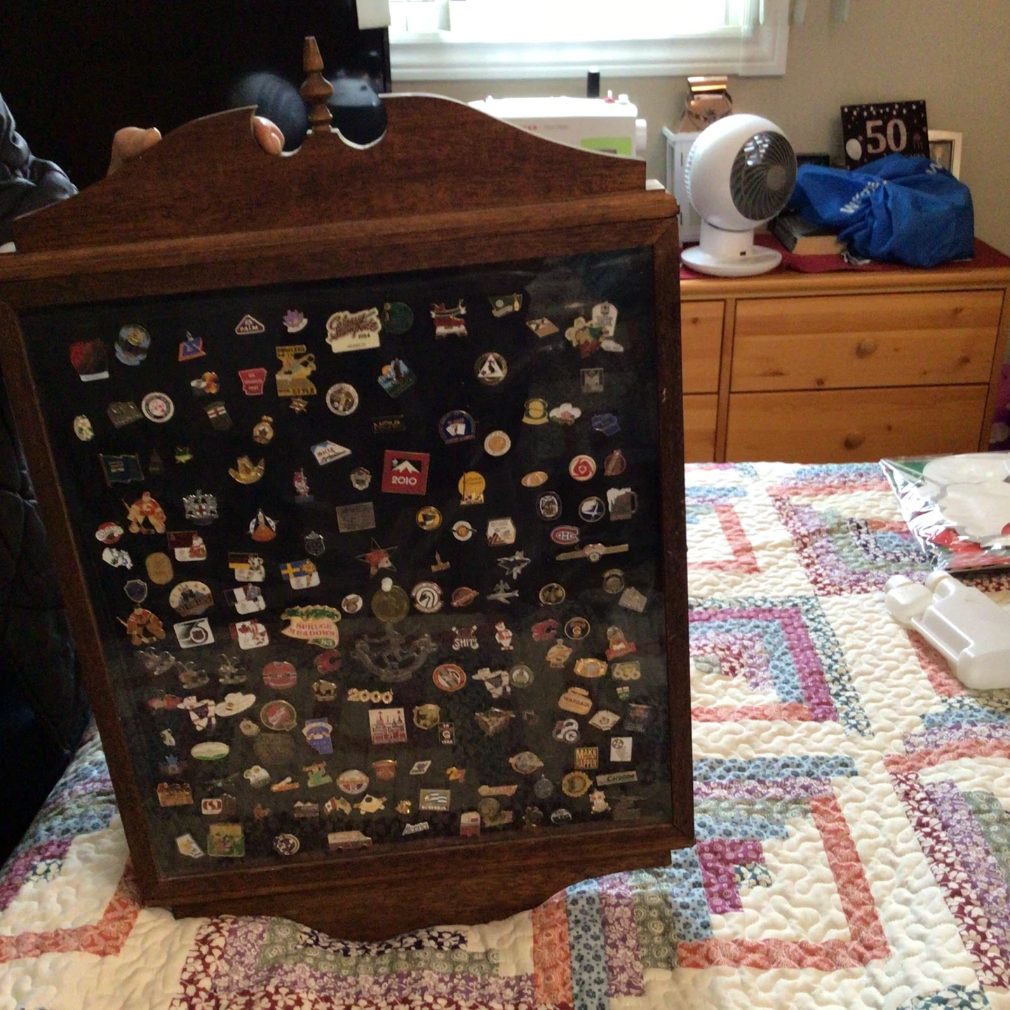 This wooden display case is filled with a variety of collectible pins. It's a great way to showcase your pin collection! The case has a dark background for good pin visibility.