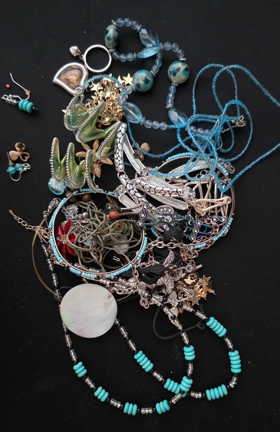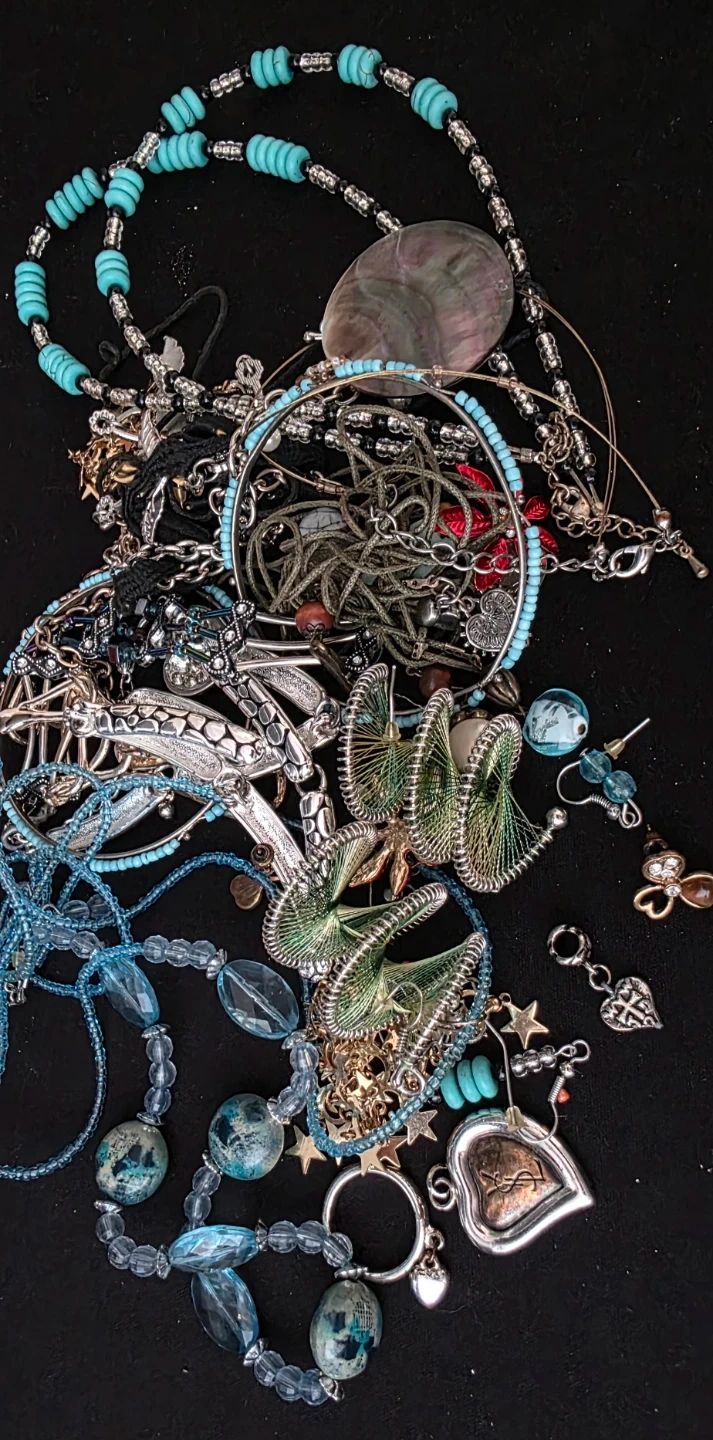 A collection of assorted jewellery including necklaces, bracelets, and earrings. Features beads, silver-tone metal, and other decorative elements. Items vary in style and design.