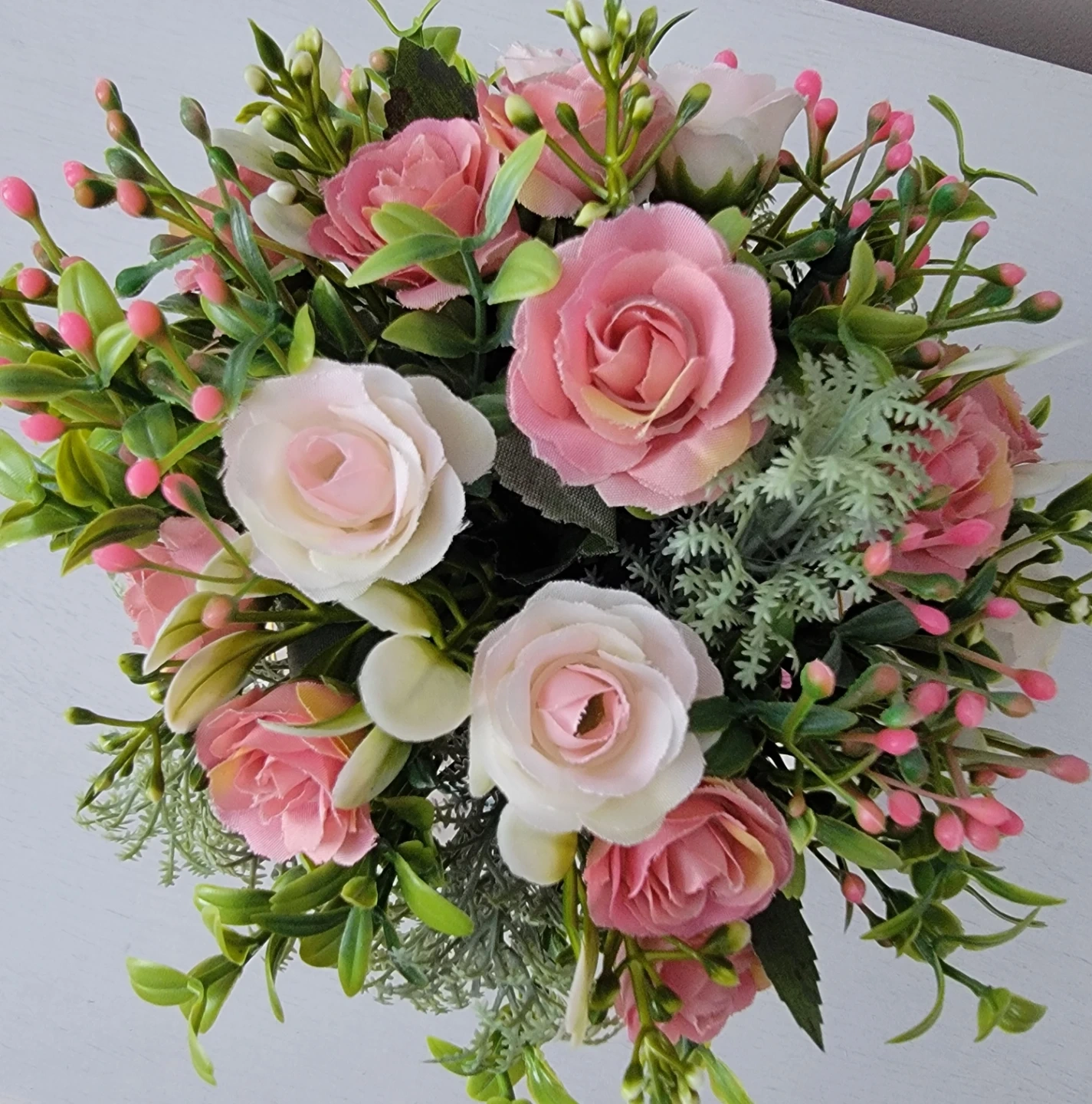 Lovely artificial flower arrangement featuring pink and white roses nestled in a vintage-style teacup and saucer. The delicate floral pattern adds a charming touch to any room. This floral display requires no watering or maintenance, making it a perfect decorative piece for homes or offices.