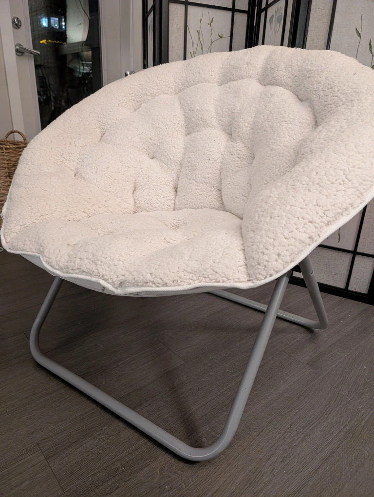 Never used. White folding chair with a soft plush cushion. It has a metal frame and folds for easy storage. The chair is in great condition and is perfect for any room. It can be used for lounging, reading, or just relaxing.