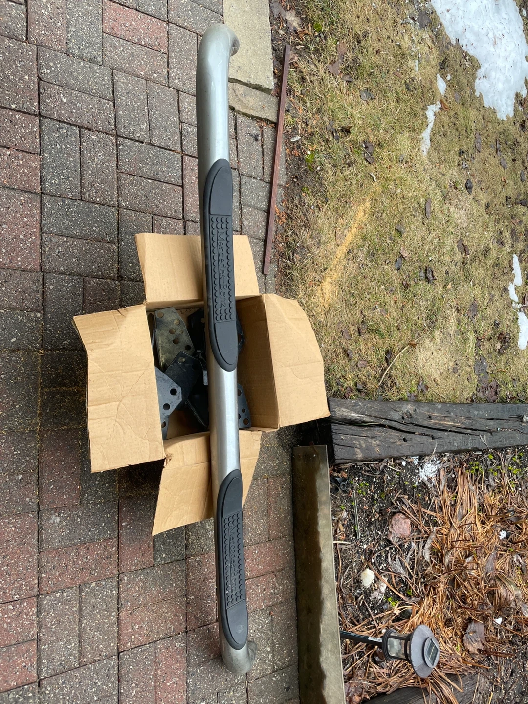 This is a silver side step bar with textured black grip pads. It's designed for easy vehicle access. Includes mounting brackets.