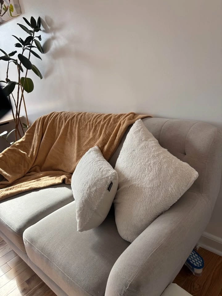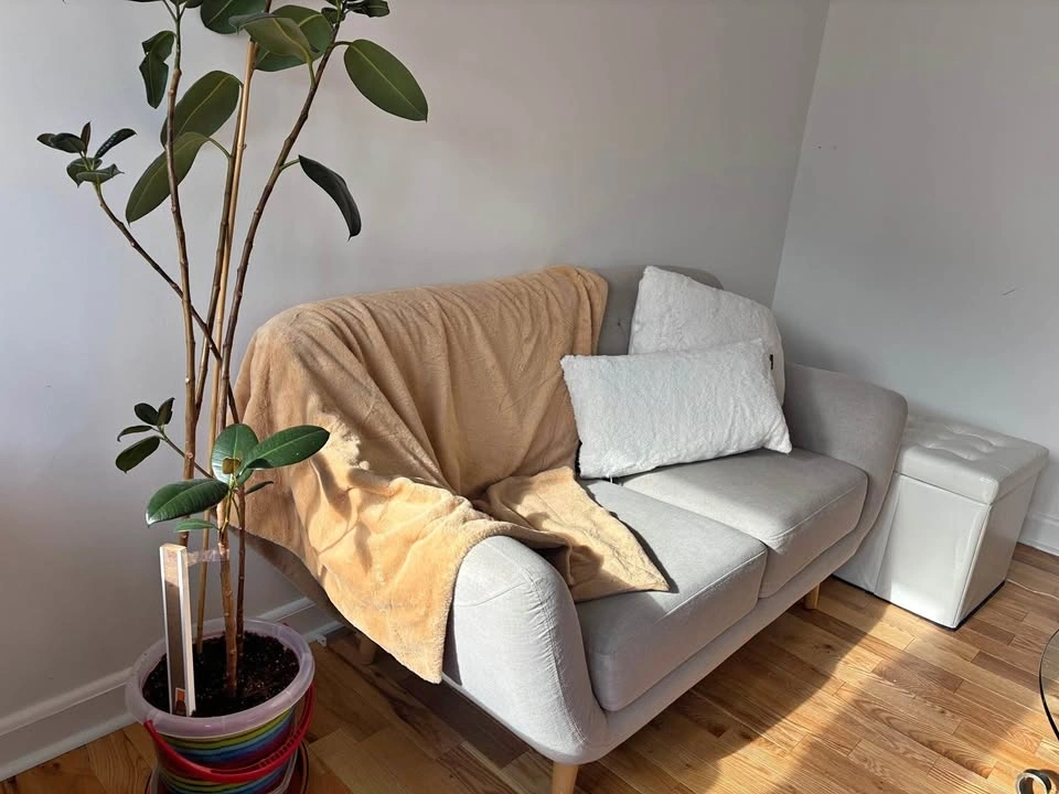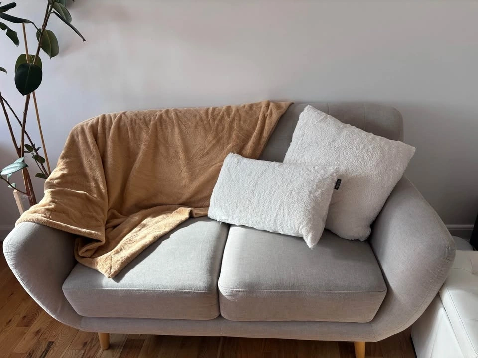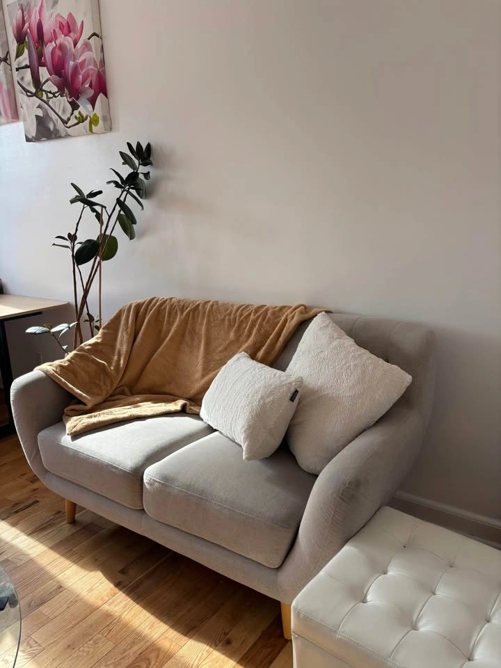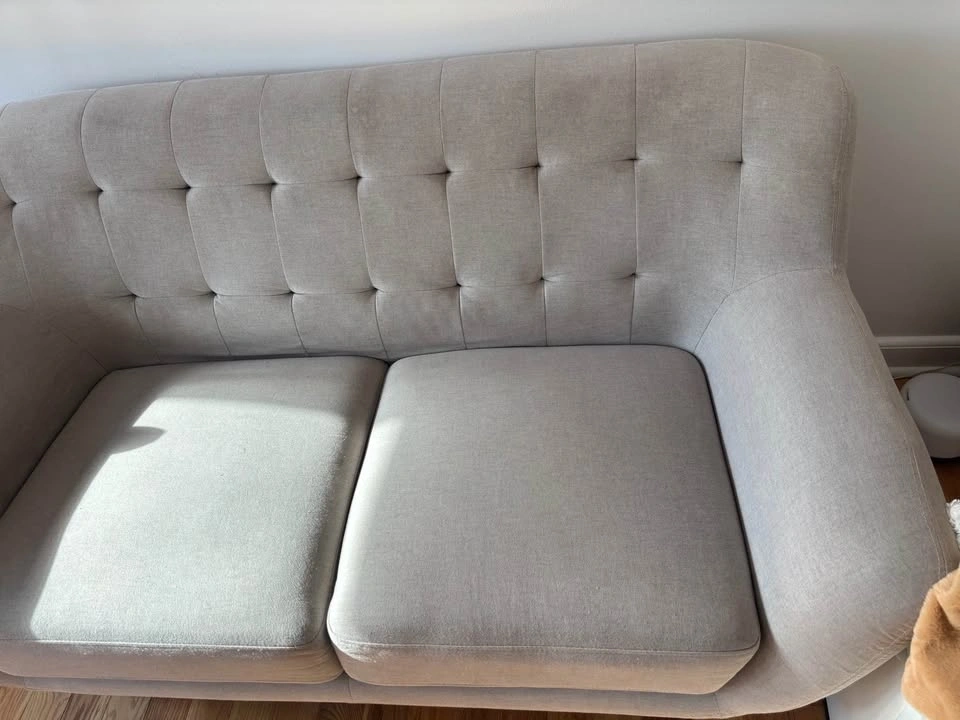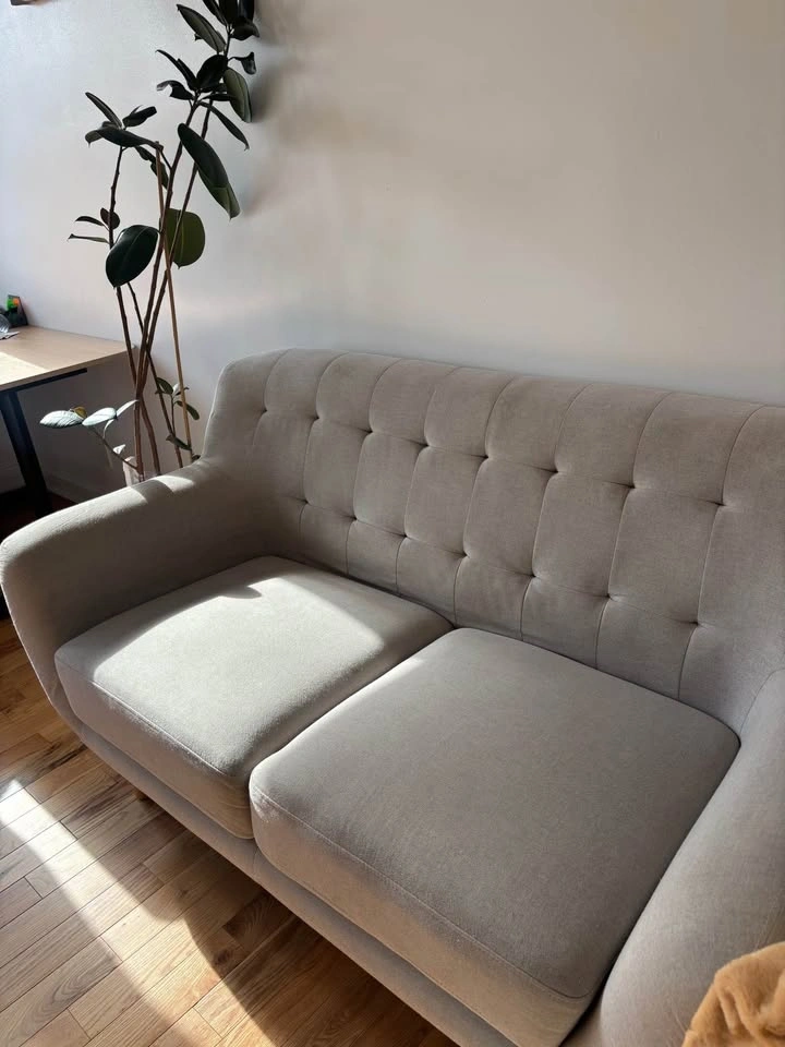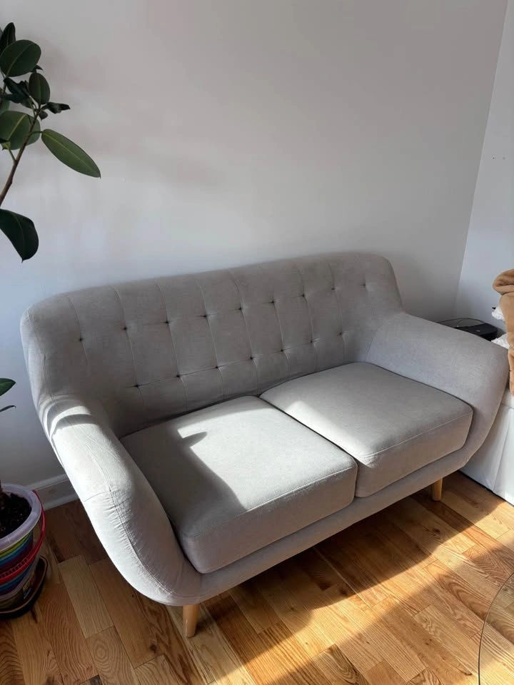 Moving out and sadly have to part ways with this gorgeous silver/light grey loveseat (Structube's Haley model). With its elegant tufted back and mid-century modern wooden legs, it brings a chic and cozy vibe to any living room, office, or small space!