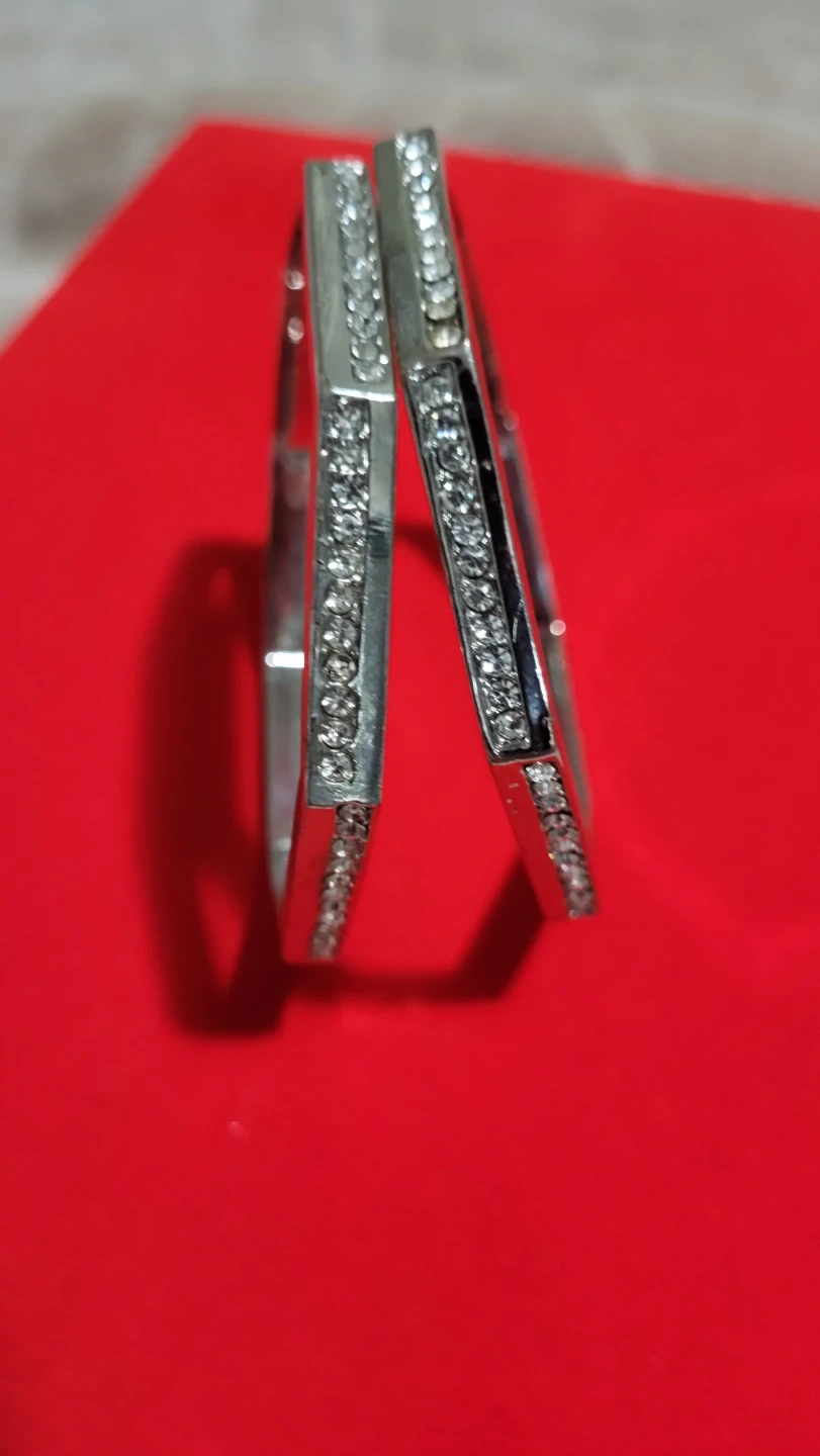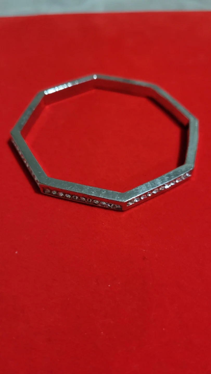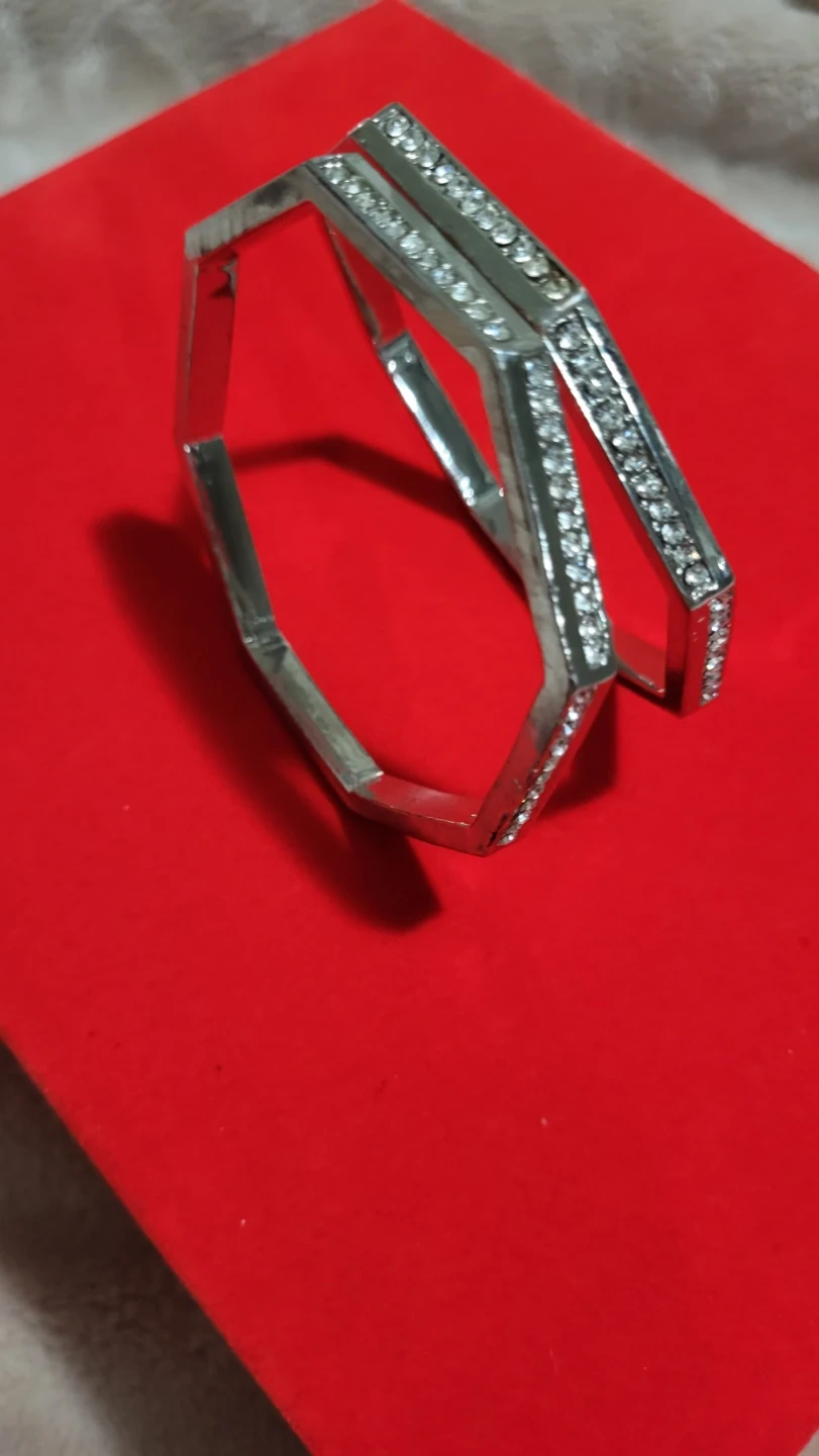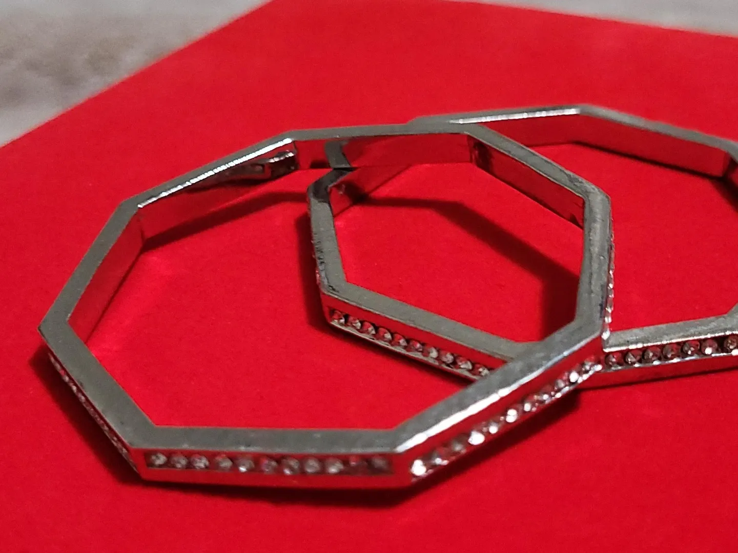 Here's a set of two silver-tone Octagon bracelets! They have a unique octagonal shape and are adorned with small rhinestones. They're in great condition and ready to accessorize your outfits
