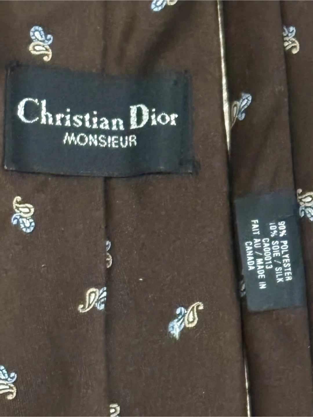 Vintage Brown Christian Dior Monsieur tie with a paisley pattern. Made in Canada. 90% polyester, 10% silk.