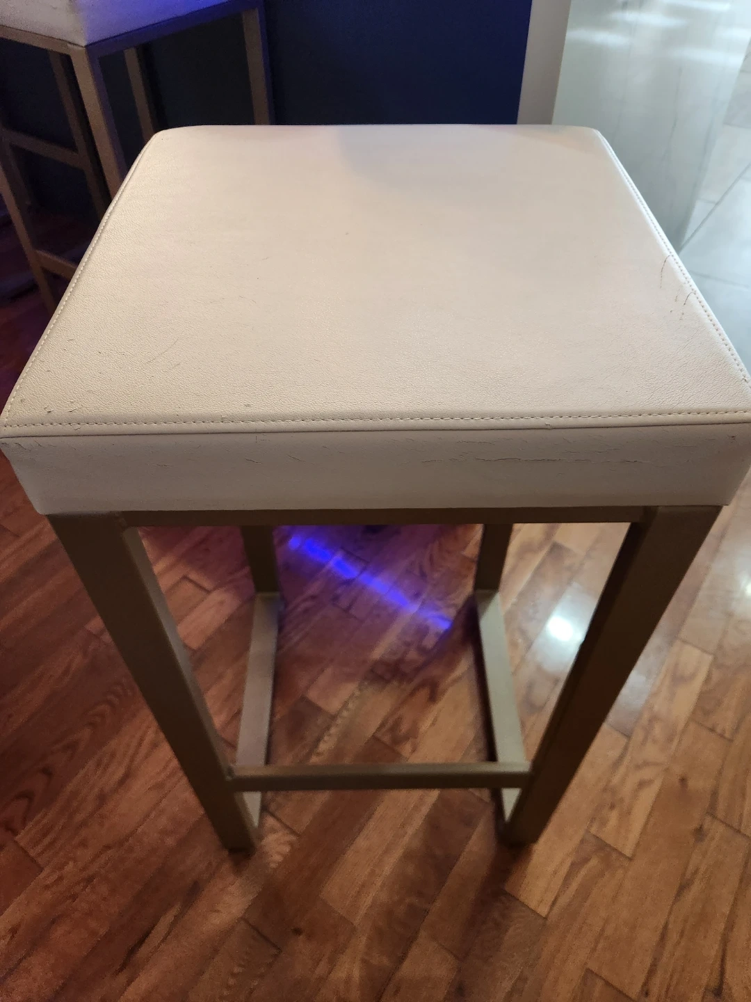 The cushions have wear on them. You can get replacement cushions from Artefac for $89 each. Metal stool part is in excellent condition. We are downsizing and don't need them anymore.