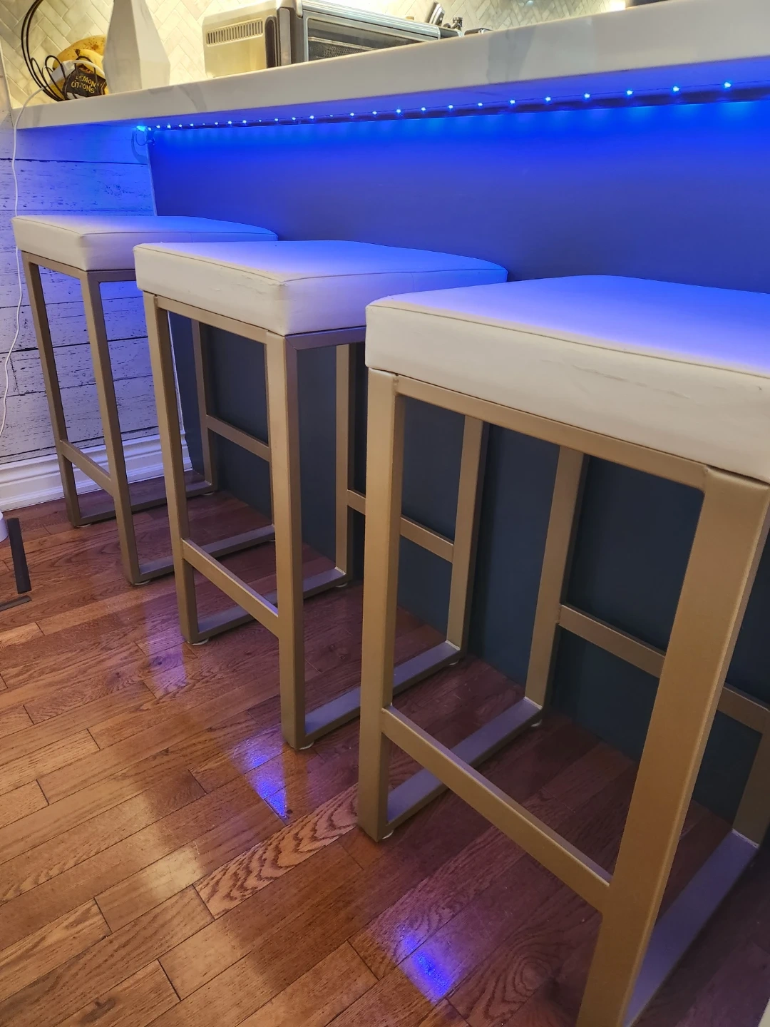 Three bar stools with light cream faux leather seats and gold metal frames. These stools would work well for a kitchen island or home bar set up.