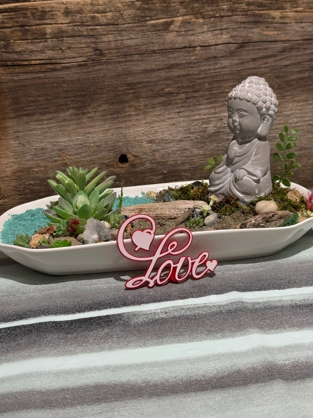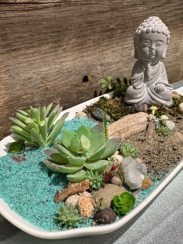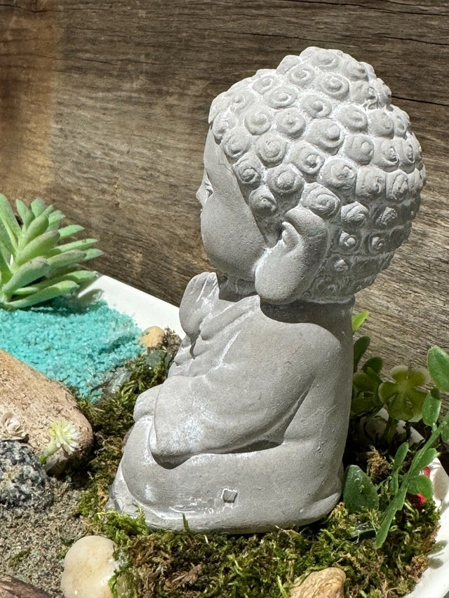 Enhance your living space with this captivating Buddha zen garden, featuring a serene Buddha statue, artfully arranged succulents, decorative rocks, and tranquil sand, all nestled in a sleek white dish. This unique piece brings a sense of peace and harmony to any room, inviting moments of reflection and calm. This zen garden is ready to bring a sense of peace to your home. If this ad is still up, the Buddha zen garden is available and waiting to find its new home! Cash accepted, Cashless payment accepted.