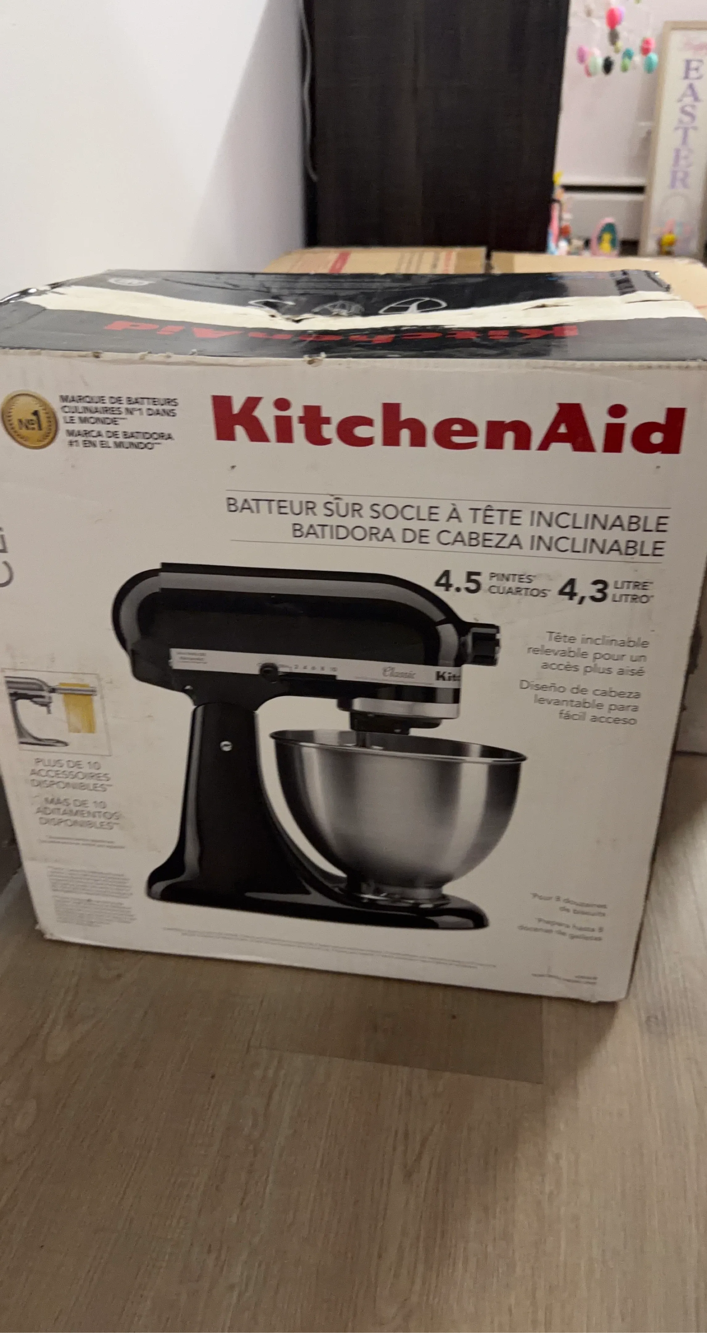 It's a KitchenAid Classic stand mixer with a 4.5-quart stainless steel bowl. It has a tilt-head design for easy access. Over 10 accessories are available for it!
