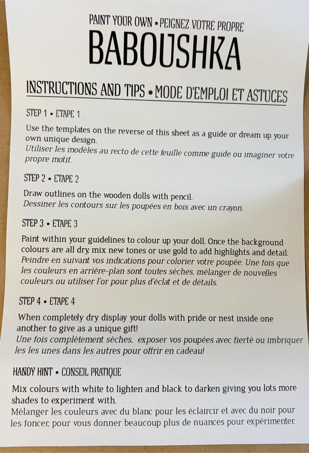 Includes everything you need to create your own set of nesting matryoshka dolls such as: