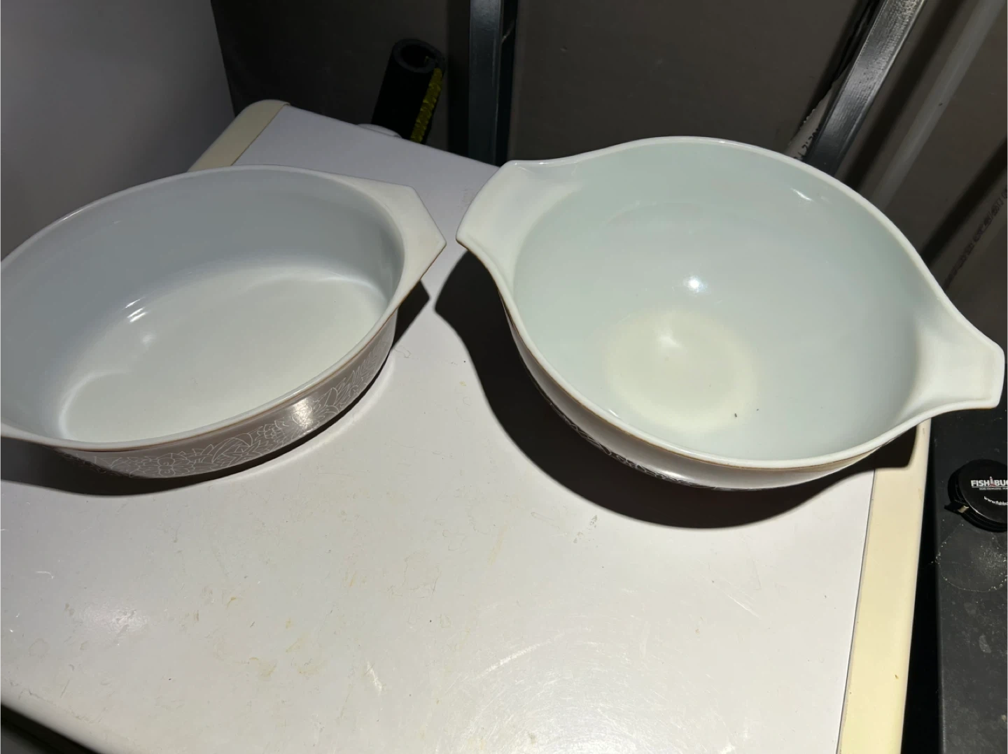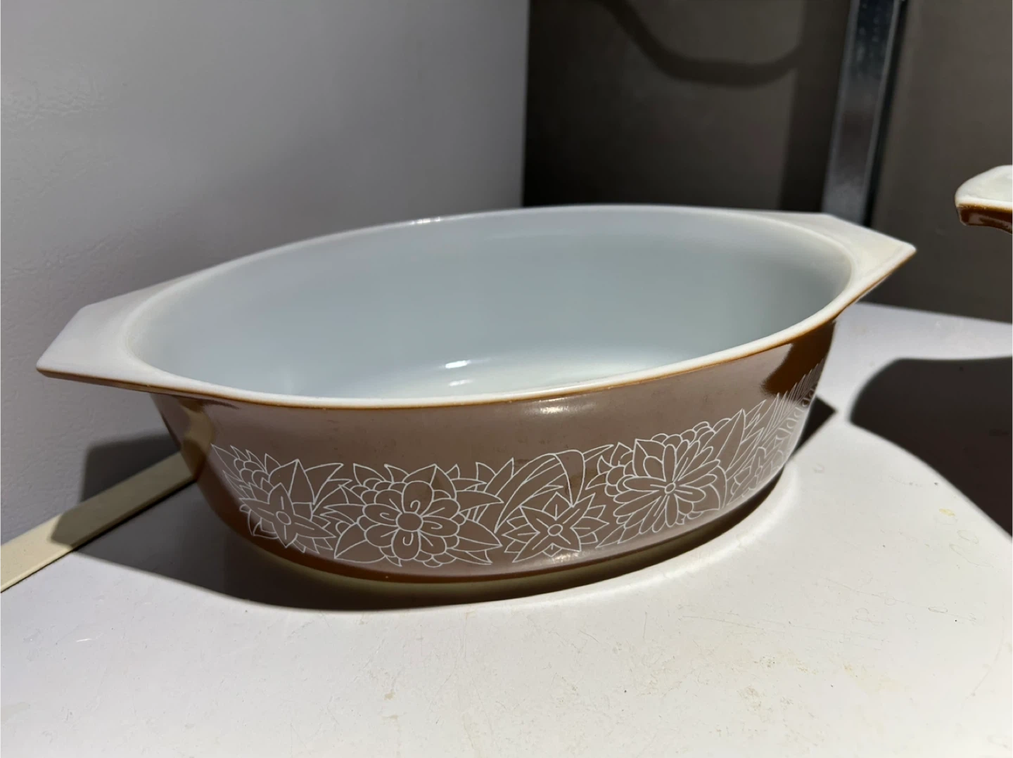 This is a set of two Pyrex mixing bowls in brown with a white floral pattern. They're made of durable milk glass. These bowls are great for mixing or serving.