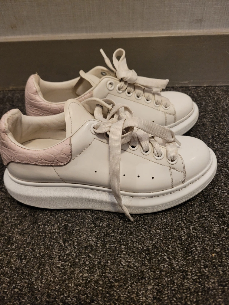 A pair of white *Authentic* Alexander McQueen leather sneakers. Laces cross over the tongue of the shoe. Soles look thick, with the brand name on the bottom. Wearing these will make your feet feel secure and supported.