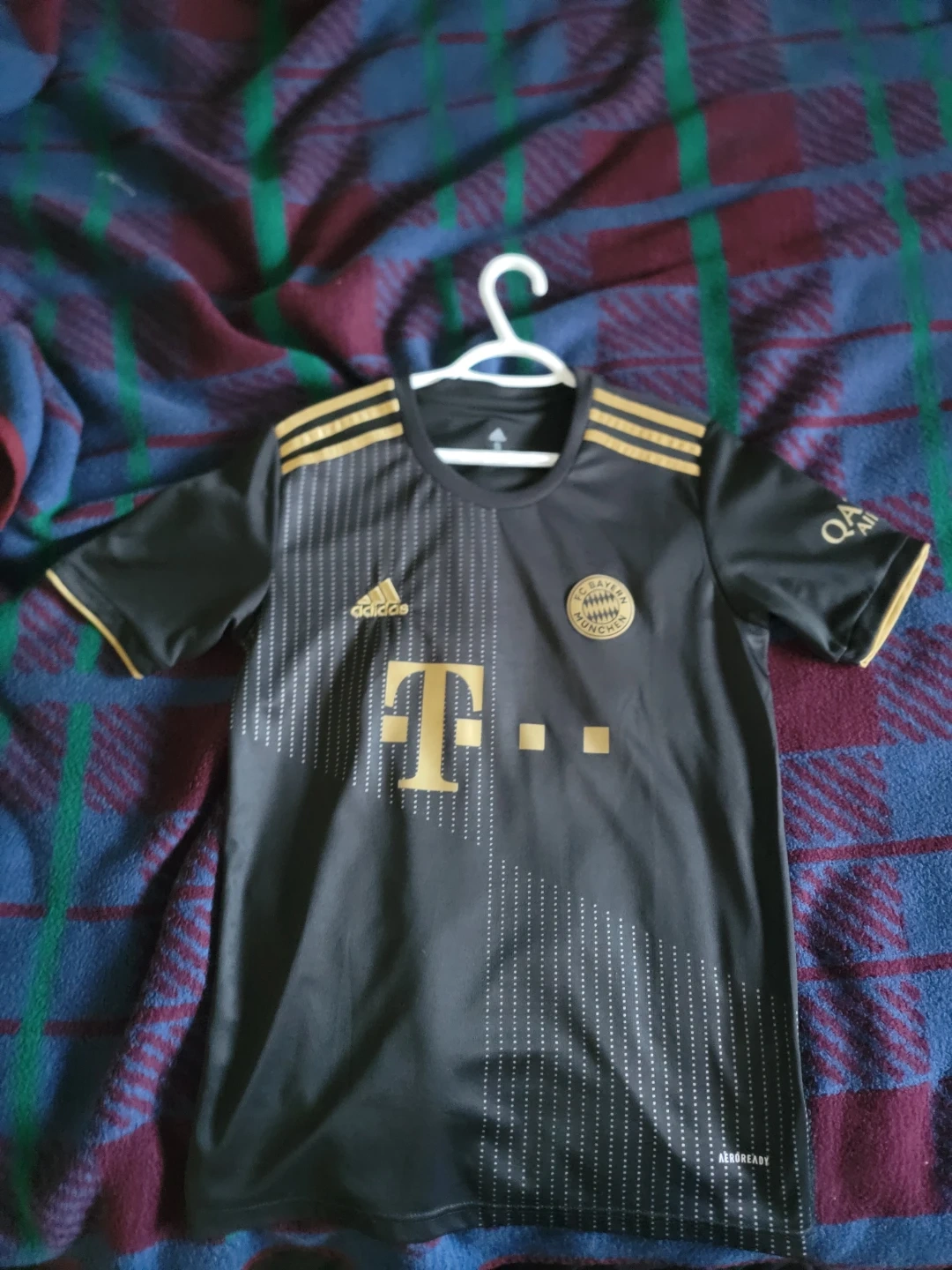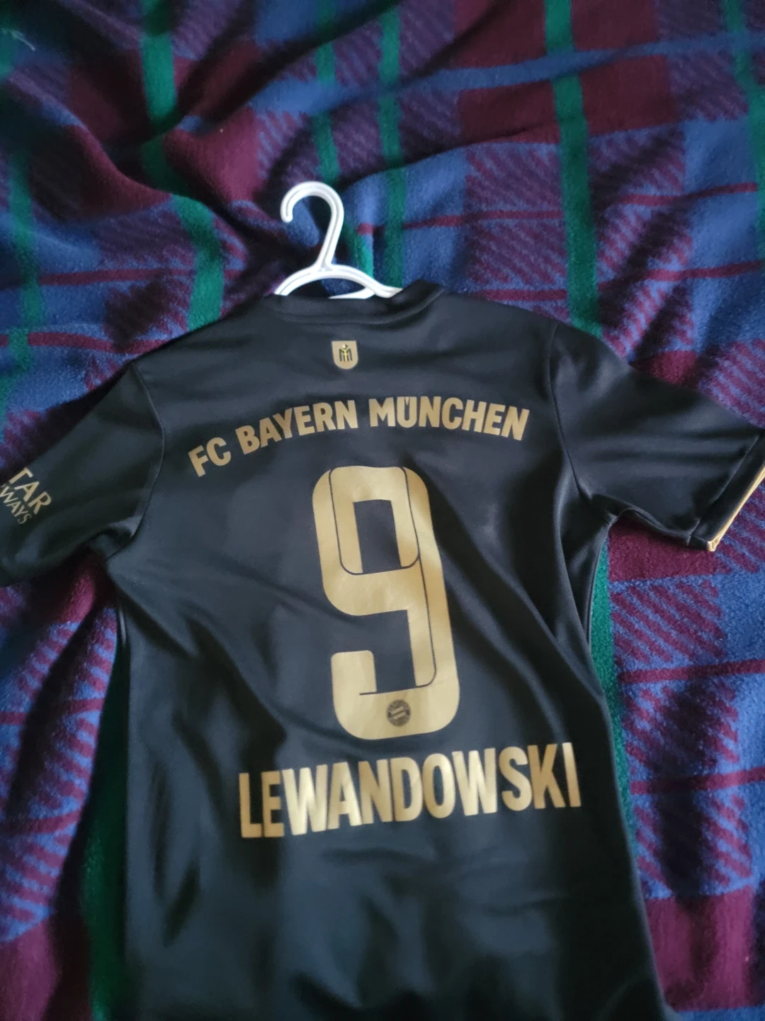 This is an FC Bayern Munich soccer jersey featuring Lewandowski and the number 9. It's black with gold accents and the iconic Adidas stripes. Made with Aeroready technology.