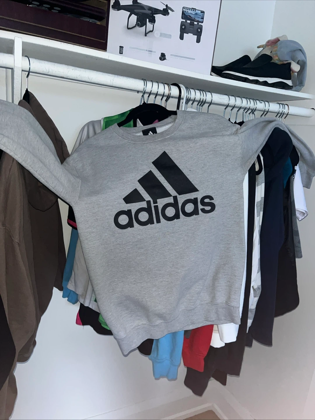 This is a grey crewneck sweatshirt from Adidas. It features the iconic Adidas logo on the front. Made from a comfortable cotton blend.