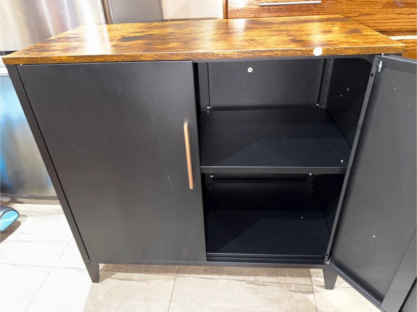 This black storage cabinet has a rustic wood top and sleek metal doors. It features two adjustable interior shelves for ample storage space. The cabinet's dimensions are 31.4" W x 15.7" D x 29.9" H. It's a great addition for organizing any room!