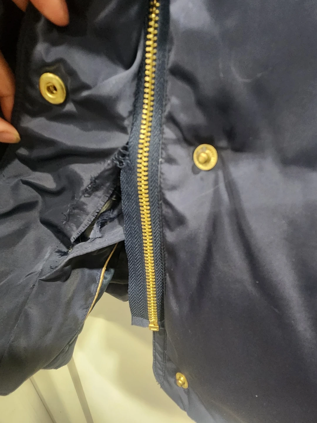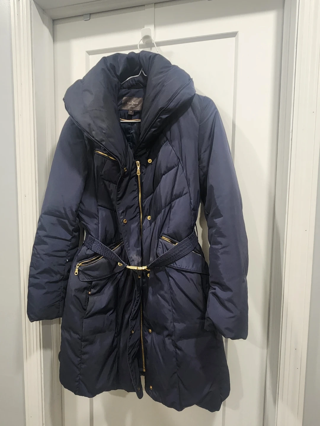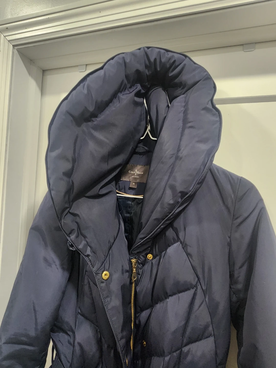 Navy blue puffer coat by Cole Haan. Features a belted waist and gold-tone zippers. Size medium. There is some damage to the stitching near the zipper, as shown in photos. Easily fixable with some sewing. Other than that it is in great condition.