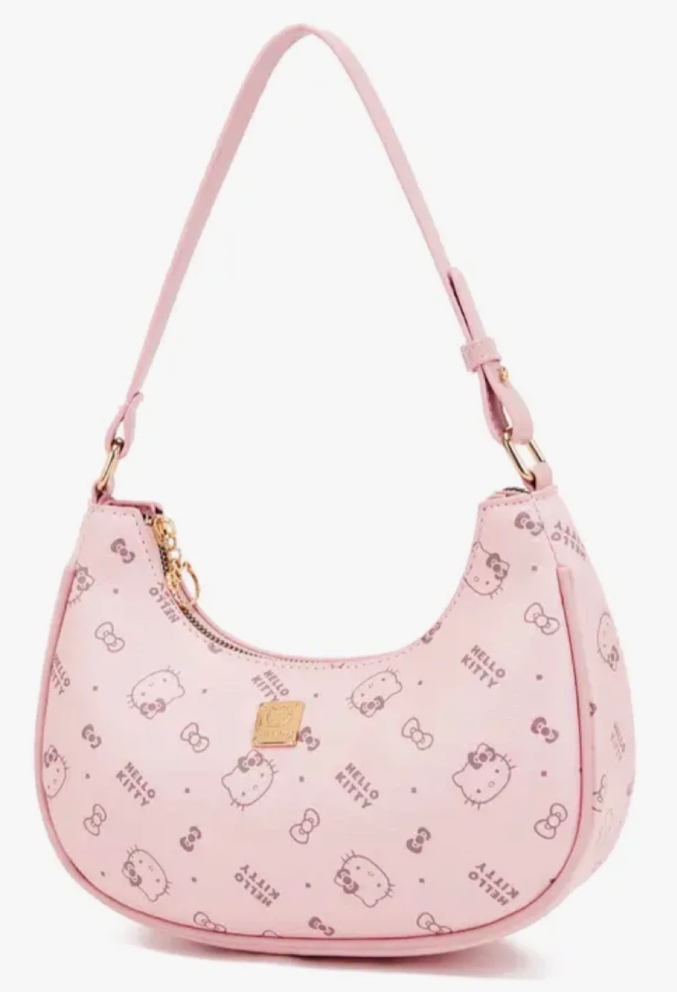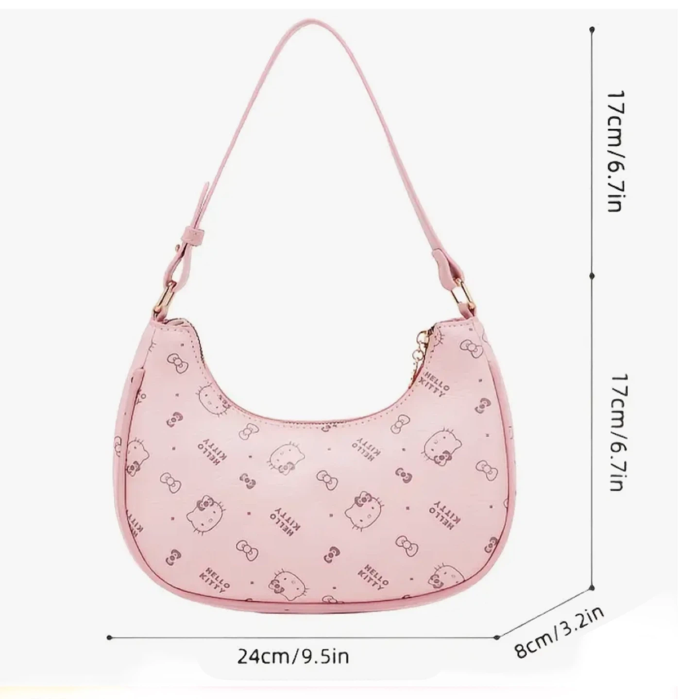 Pink Hello Kitty shoulder bag. Features a cute all-over Hello Kitty and bow print. 24cm/9.5in wide, 17cm/6.7in tall, and 8cm/3.2in deep. Comes with an adjustable strap.