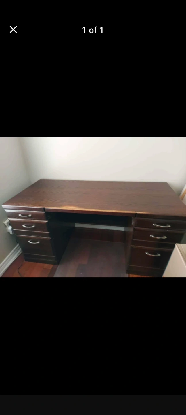 This is a dark wood executive desk. It has multiple drawers on both sides for storage. Its classic design fits well in any home office setting.