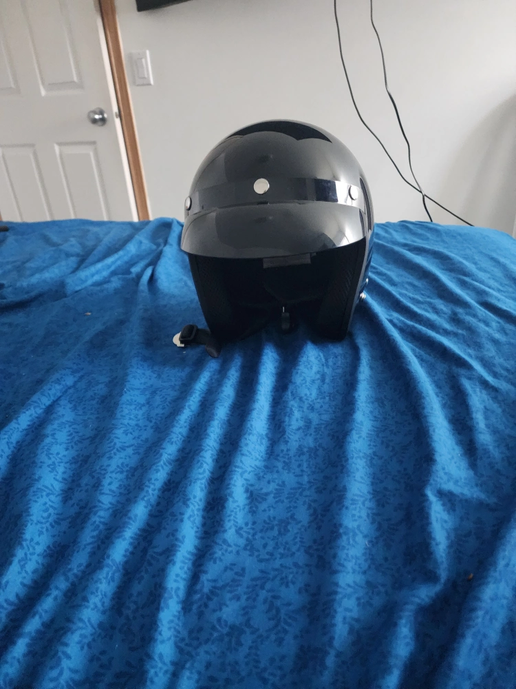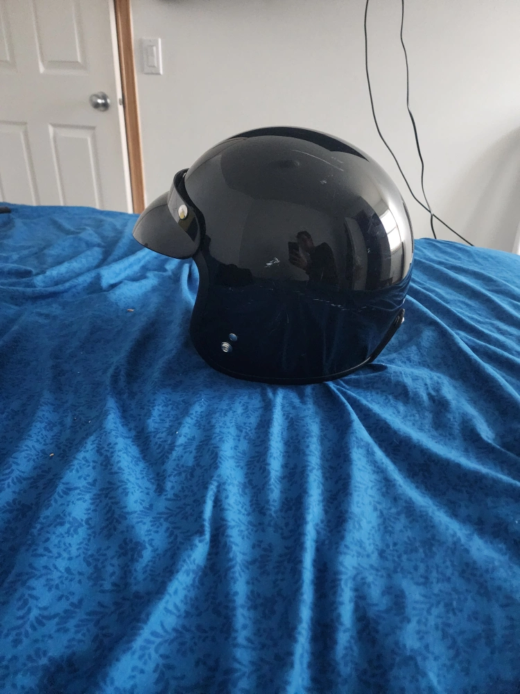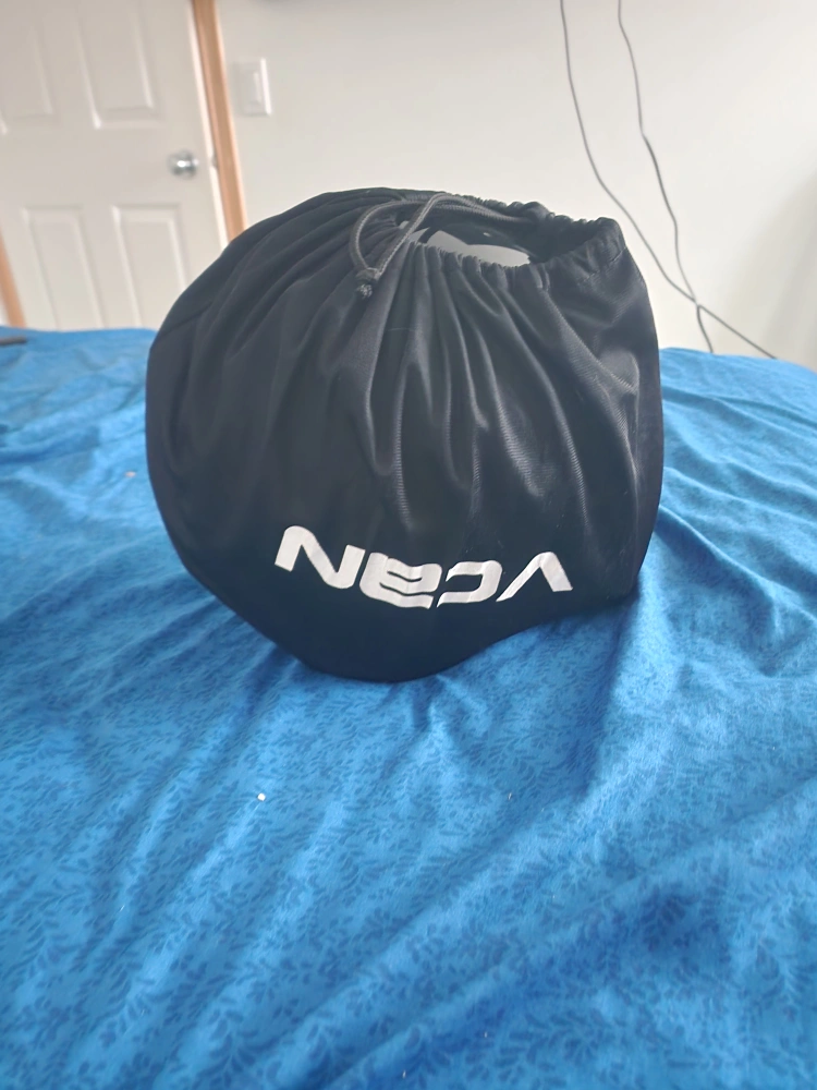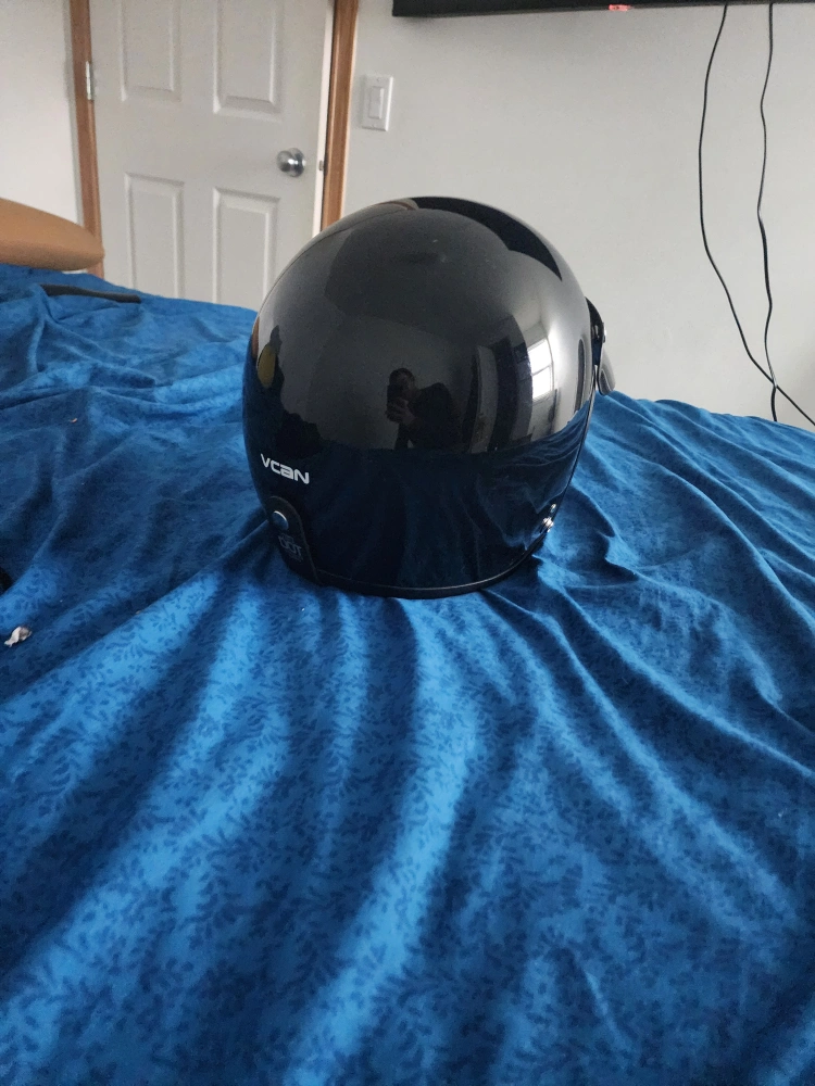 Selling a VCAN motorcycle helmet in black. It comes with a protective bag. The manufacturing date is February 2020