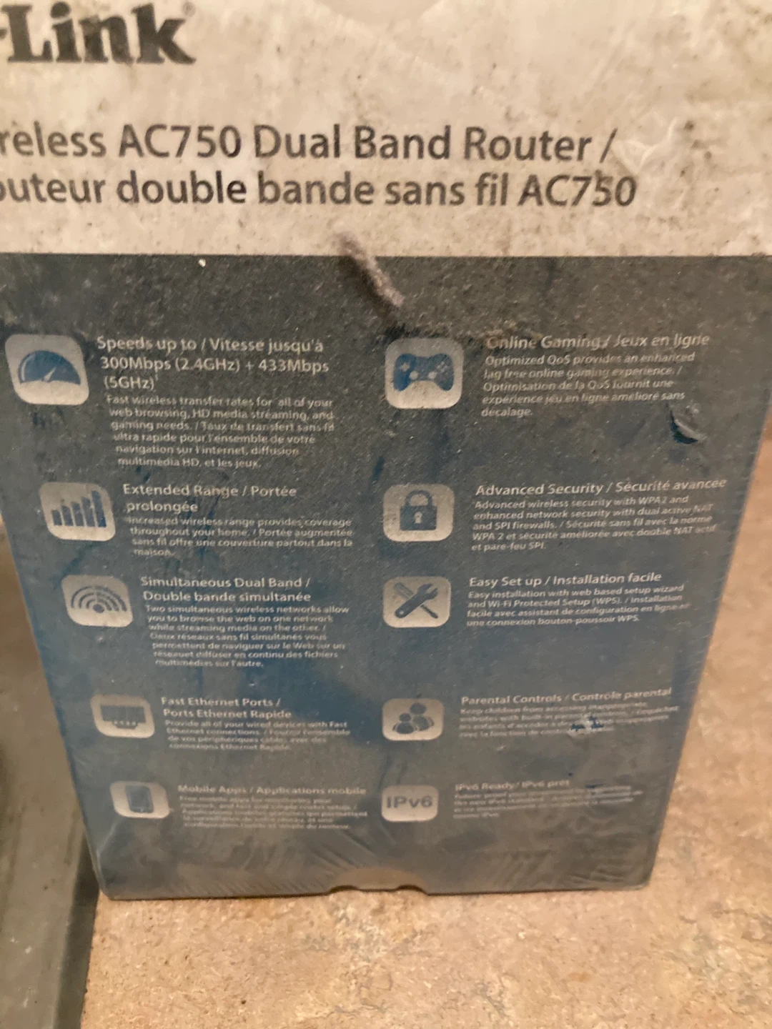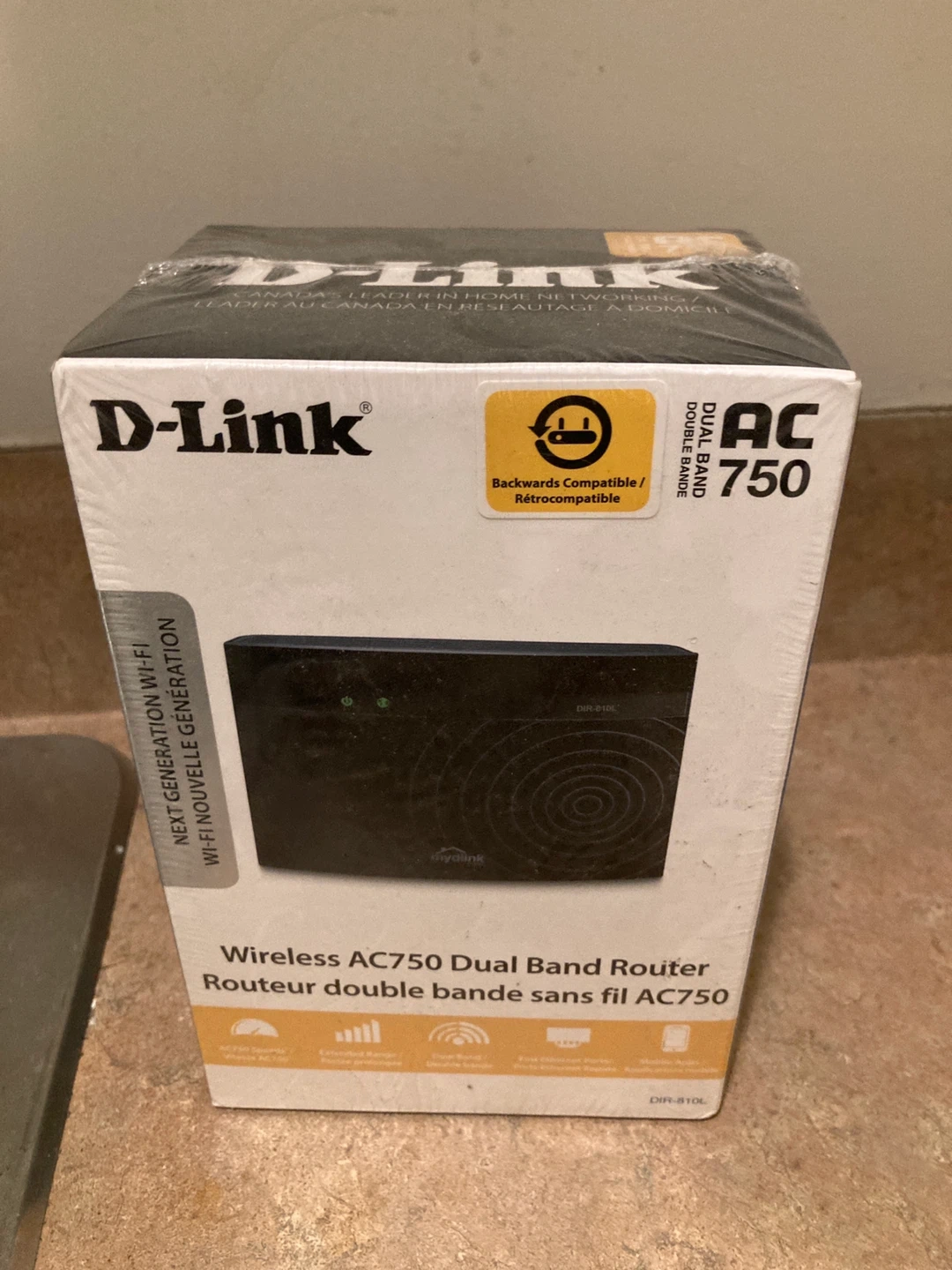 This D-Link AC750 Dual Band Router offers wireless speeds up to 300Mbps (2.4GHz) + 433Mbps (5GHz). It includes an Ethernet cable, power adapter, and a quick install guide. Optimized QoS provides an enhanced lag-free online gaming experience.